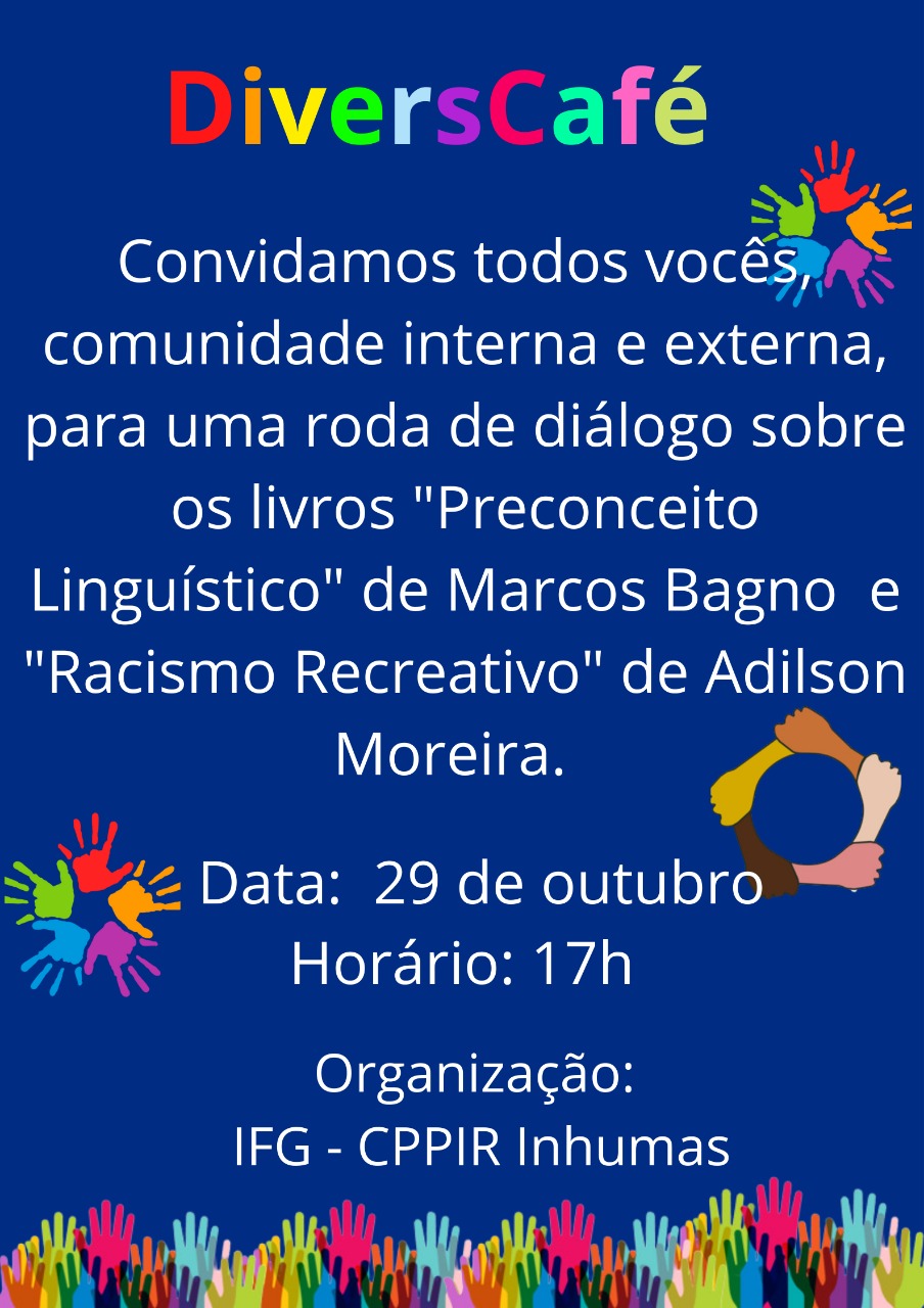 A Comissão Permanente de Políticas de Promoção da Igualdade Étnico-Racial (CPPIR) do IFG-Câmpus Inhumas convida a comunidade para uma roda de conversa sobre os livros "Preconceito Linguístico", de Marcos Bagno, e "Racismo Recreativo", de Adilson Moreira. A atividade será realizada no dia 29 de outubro, às 17 horas, pela plataforma Google Meet.