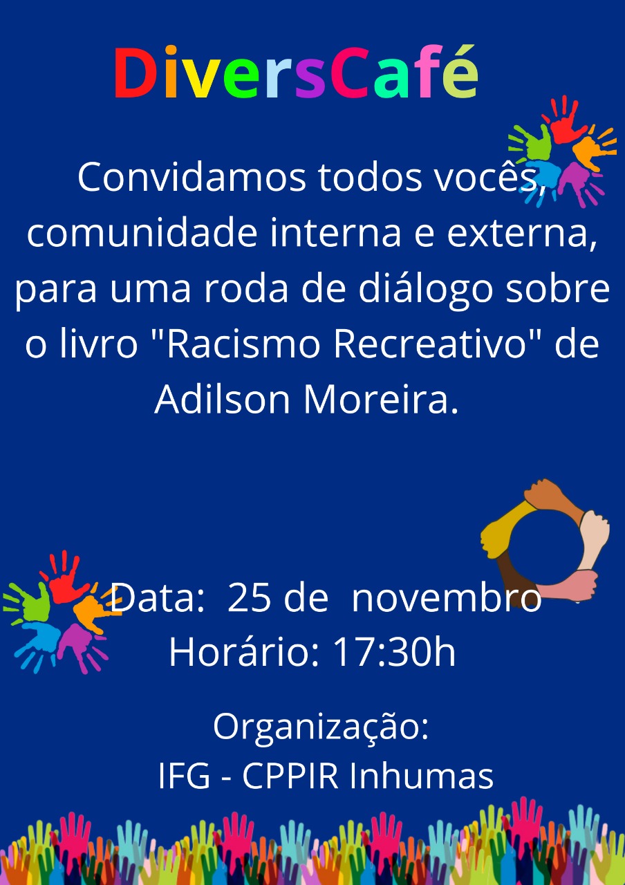 A Comissão Permanente de Políticas de Promoção da Igualdade Étnico-Racial do IFG-Câmpus Inhumas (CPPIR Local) promove, no dia 25 de novembro, às 17h30, mais uma edição do DiversCafé. Desta vez, a roda de diálogo será sobre o livro "Racismo Recreativo", de Adilson Moreira.