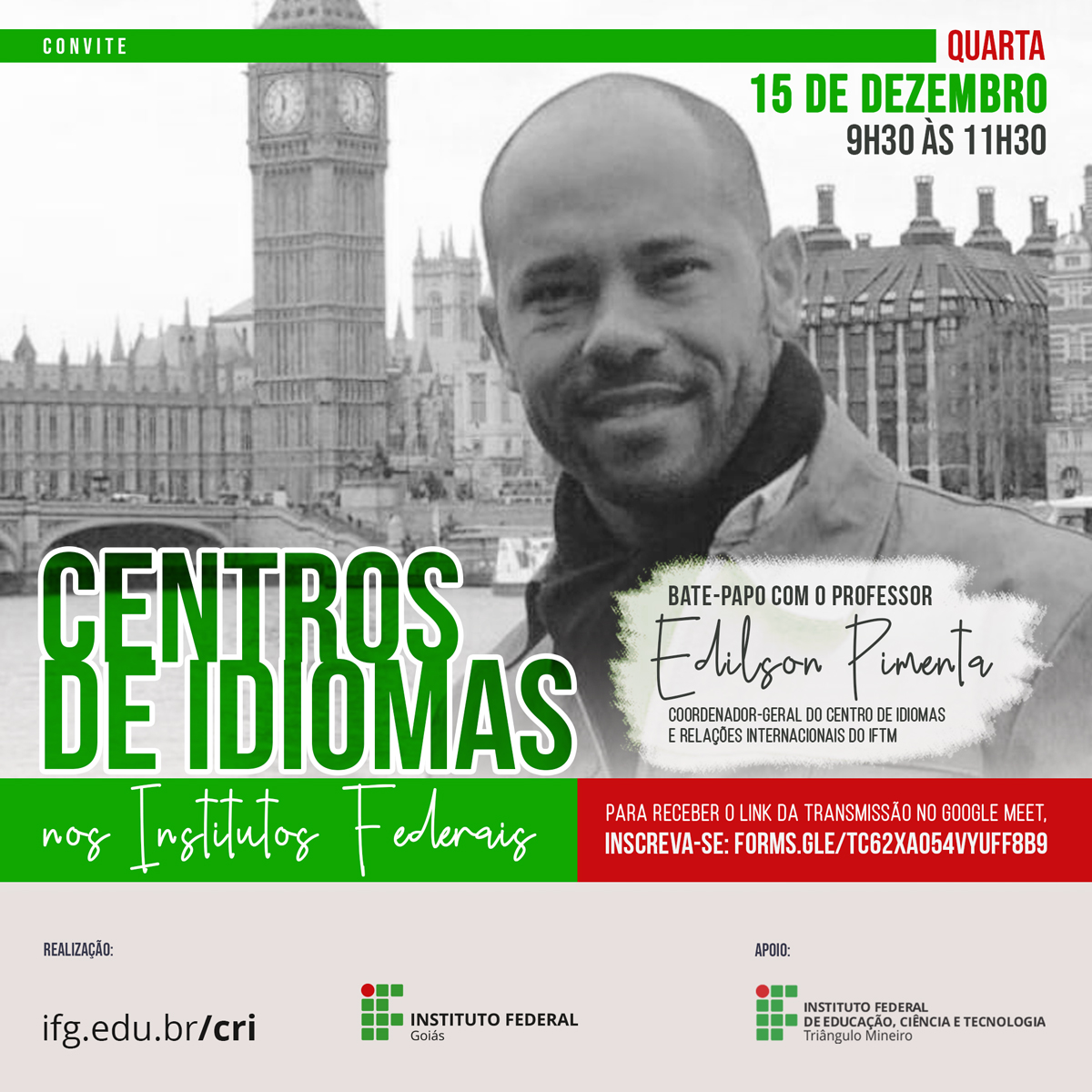 A Coordenação de Relações Internacionais do IFG realizará no dia 15 de dezembro, às 11h30, um bate-papo com o professor Edilson Pimenta, do Instituto Federal do Triângulo Mineiro (IFTM), o corpo docente da área de linguagens e os(às) gestores(as) do IFG, sobre a experiência exitosa do Centro de Idiomas do IFTM. Participe!