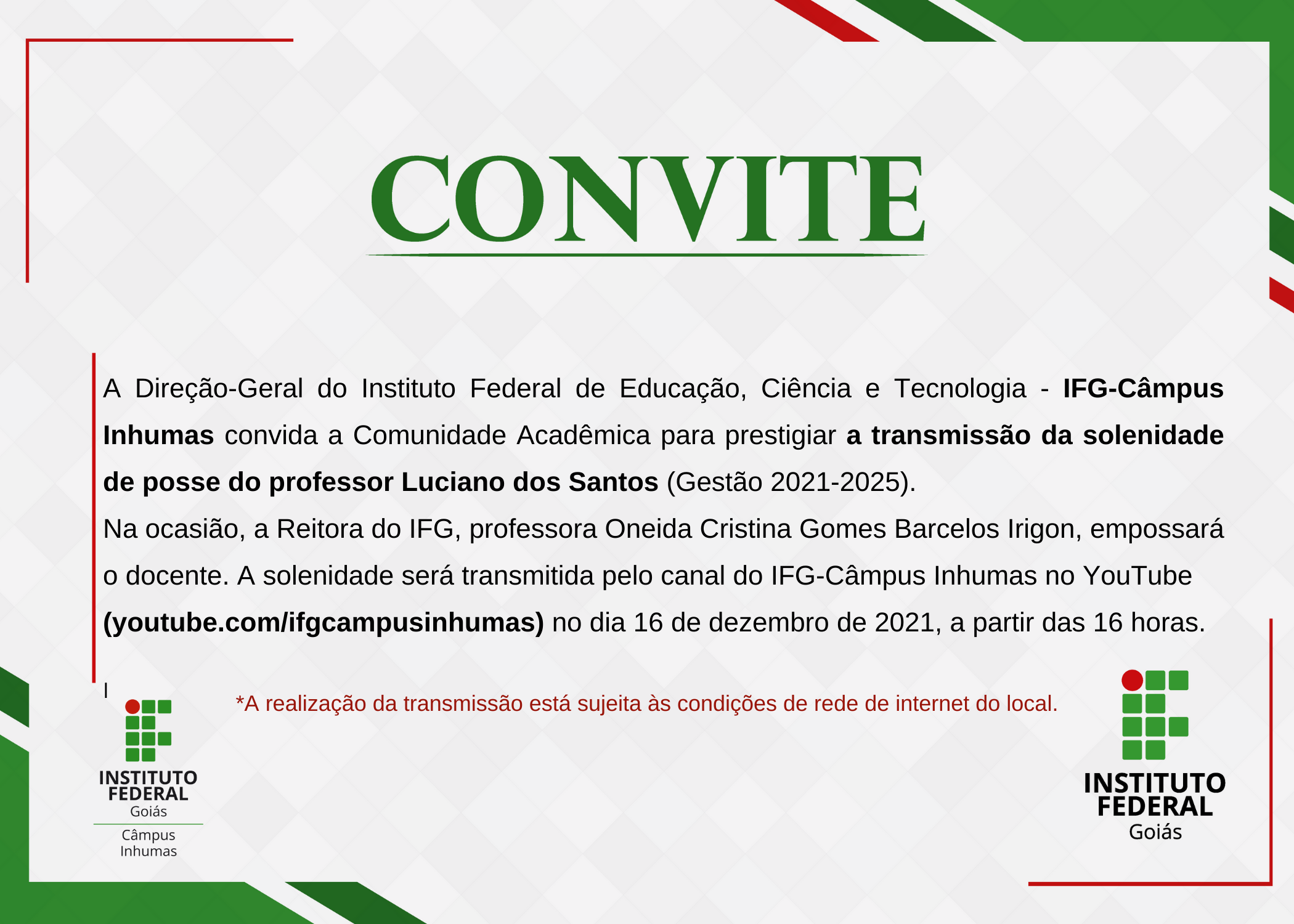 A solenidade de posse do diretor-geral do IFG-Câmpus Inhumas, professor Luciano dos Santos, será realizada nesta quinta-feira, 16 de dezembro, a partir das 16 horas, pelo canal do câmpus no YouTube.