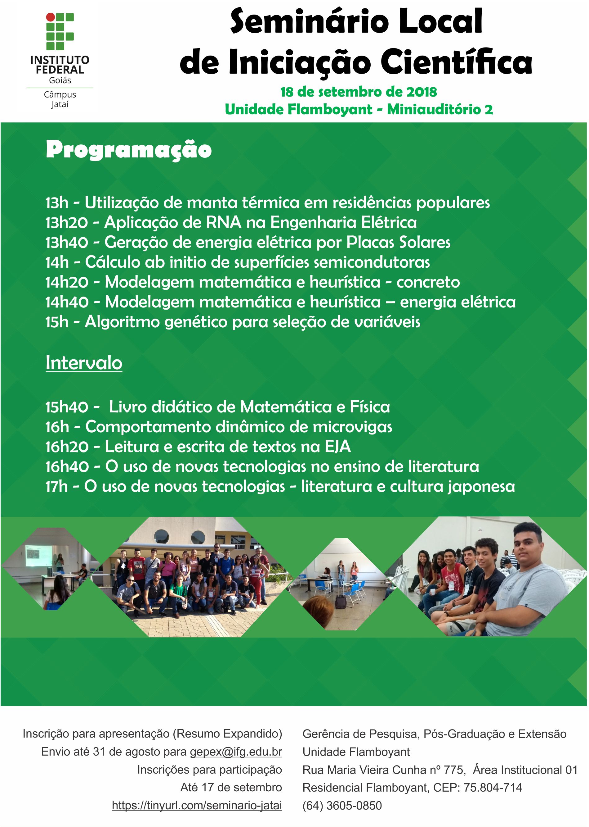 No dia 18 de setembro de 2018, a Geppex promoverá o Seminário Local de Iniciação Científica, com os objetivos de contribuir para a divulgação da pesquisa realizada por estudantes do IFG e de preparar os trabalhos para a apresentação no Simpeex 2018.