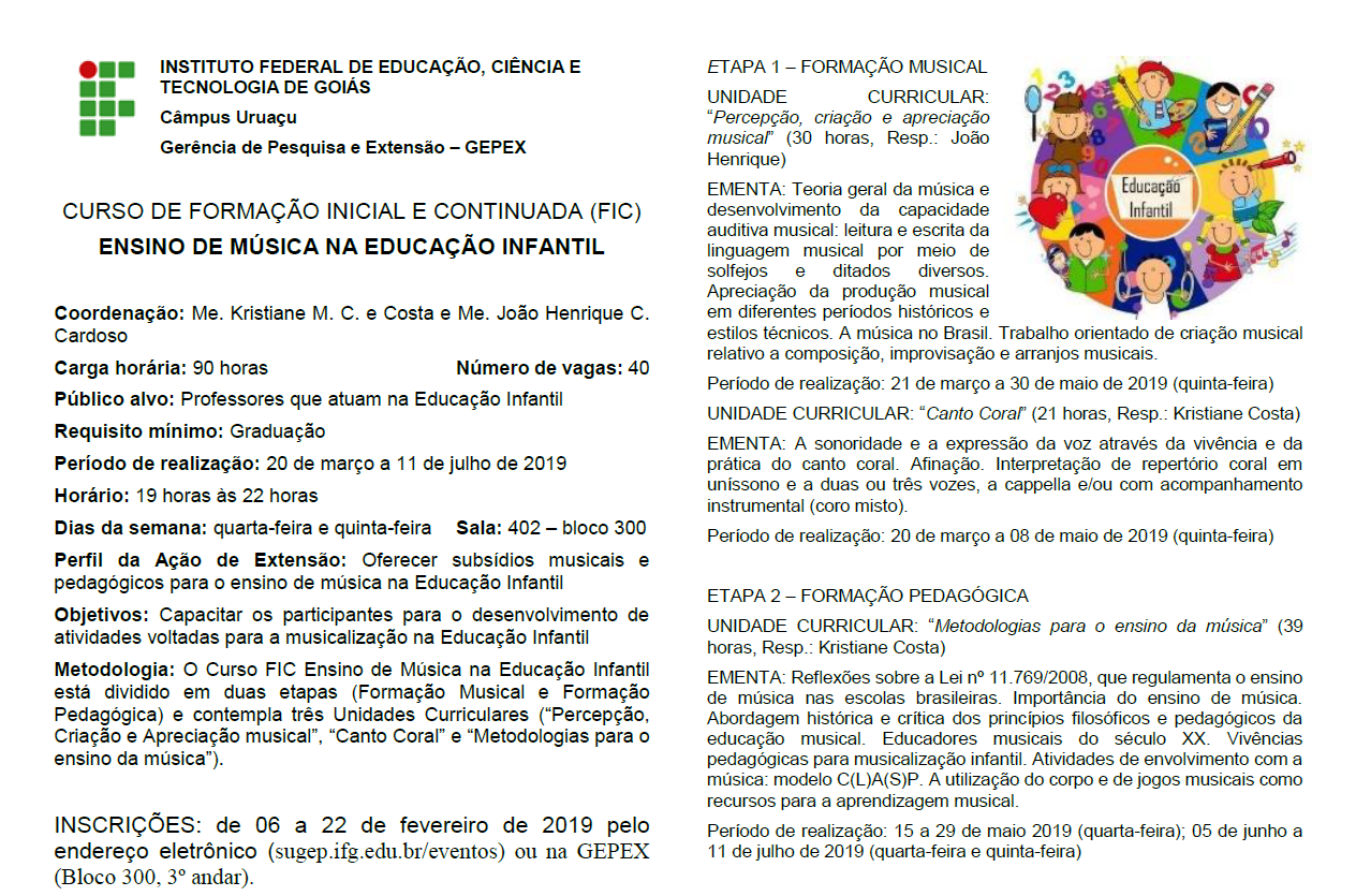 O Instituto Federal de Goiás - Câmpus Uruaçu, está ofertando o curso de Ensino de Música, pelos professores Me. Kristiane Munique Costa e Costa e Me. João Henrique Correa Cardoso.