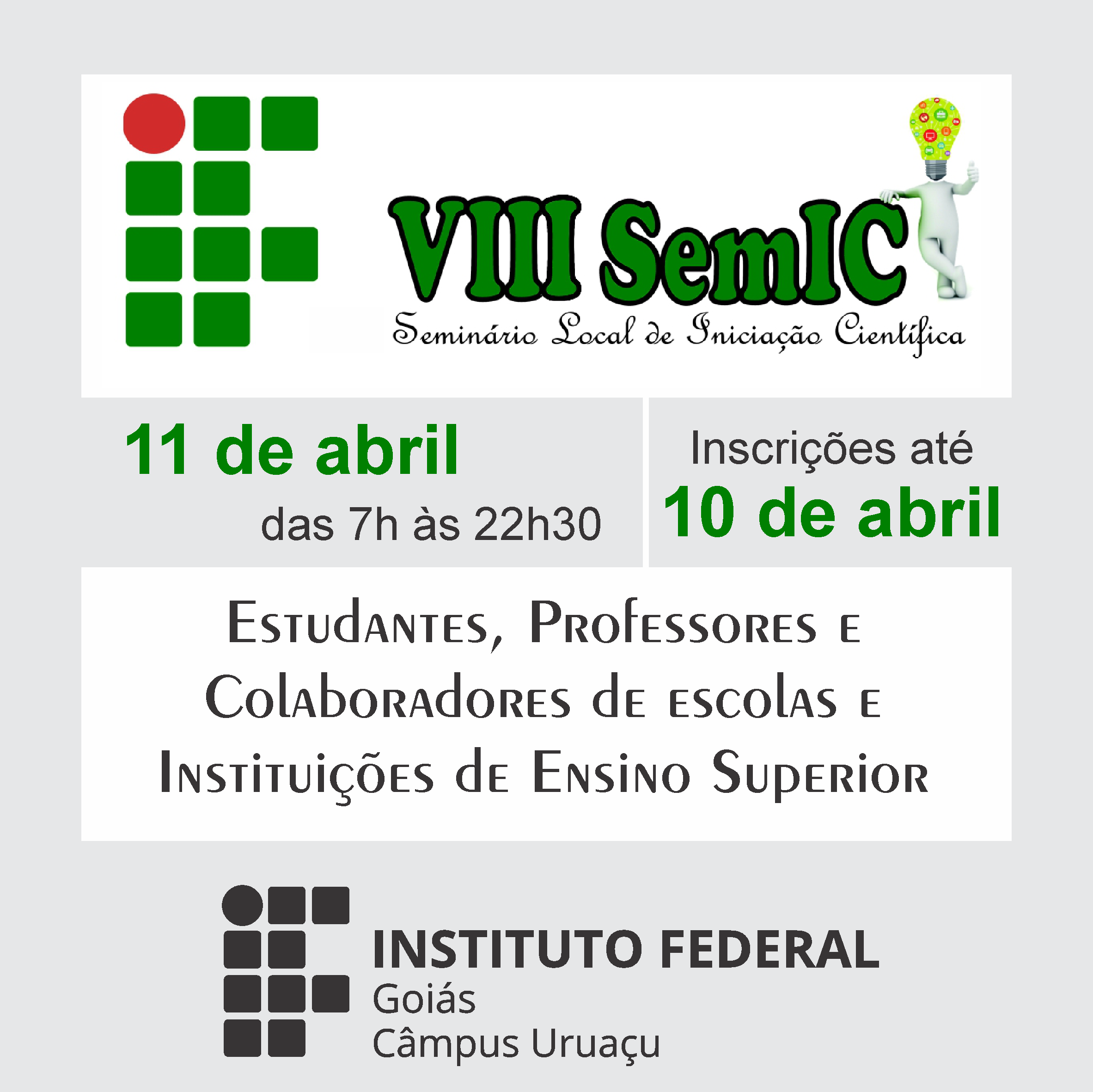 O VIII Seminário Local de Iniciação Científica é um ambiente para o compartilhamento de ideias, projetos, experiências e reflexões acerca das atividades de pesquisa em Uruaçu.