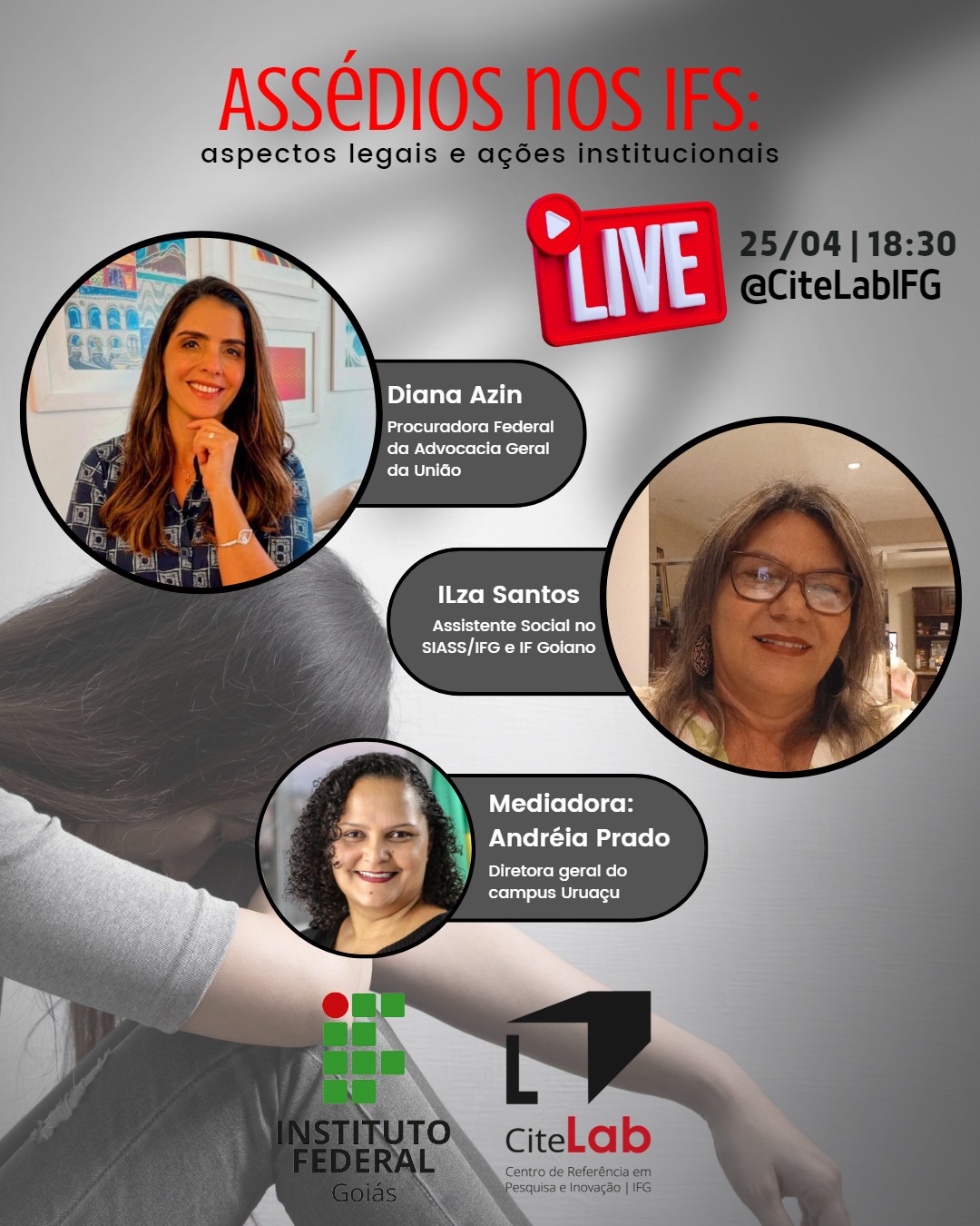 No dia 25 de abril, terça-feira, às 18h30, será realizada uma live com o tema “Assédios nos IFs: aspectos legais e ações institucionais”. A atividade contará com a presença da procuradora federal da Advocacia-Geral da União (AGU), Diana Guimarães Azin, e da assistente social do Subsistema Integrado de Atenção à Saúde do Servidor Federal (SIASS/IFG e IF Goiano), Ilza de Carvalho dos Santos. A live será mediada pela diretora-geral do Câmpus Uruaçu do Instituto Federal de Goiás, Andréia Alves do Prado.