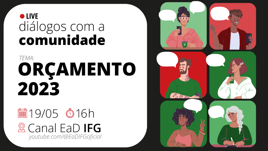 O Instituto Federal de Goiás (IFG) realizará no dia 19 de maio a primeira edição do “Diálogos com a comunidade”. O tema será “Orçamento 2023”. O evento será realizado às 16h e contará com transmissão ao vivo pelo YouTube, no canal EaD IFG oficial, por meio do link: https://www.youtube.com/watch?v=9JuCi19QIbw.
