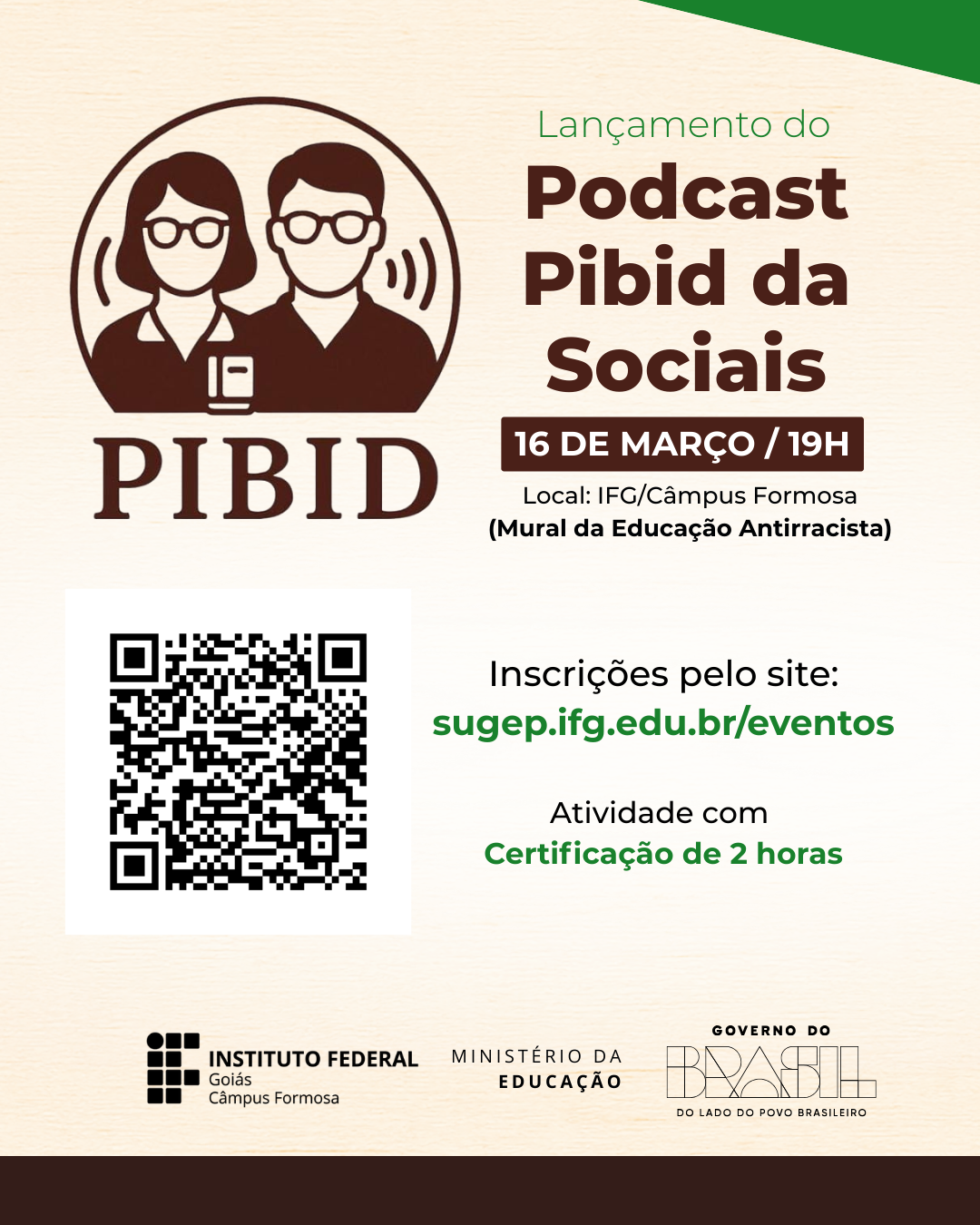 Na próxima segunda-feira, 16 de março, às 19h, o Mural da Educação Antirracista do Câmpus Formosa do Instituto Federal de Goiás (IFG) será palco do lançamento do Podcast Pibid da Sociais, coordenado pela professora Janaína Fernandes. A atividade contará com uma Roda de Conversa sobre o programa de áudio e o processo de sua produção.
