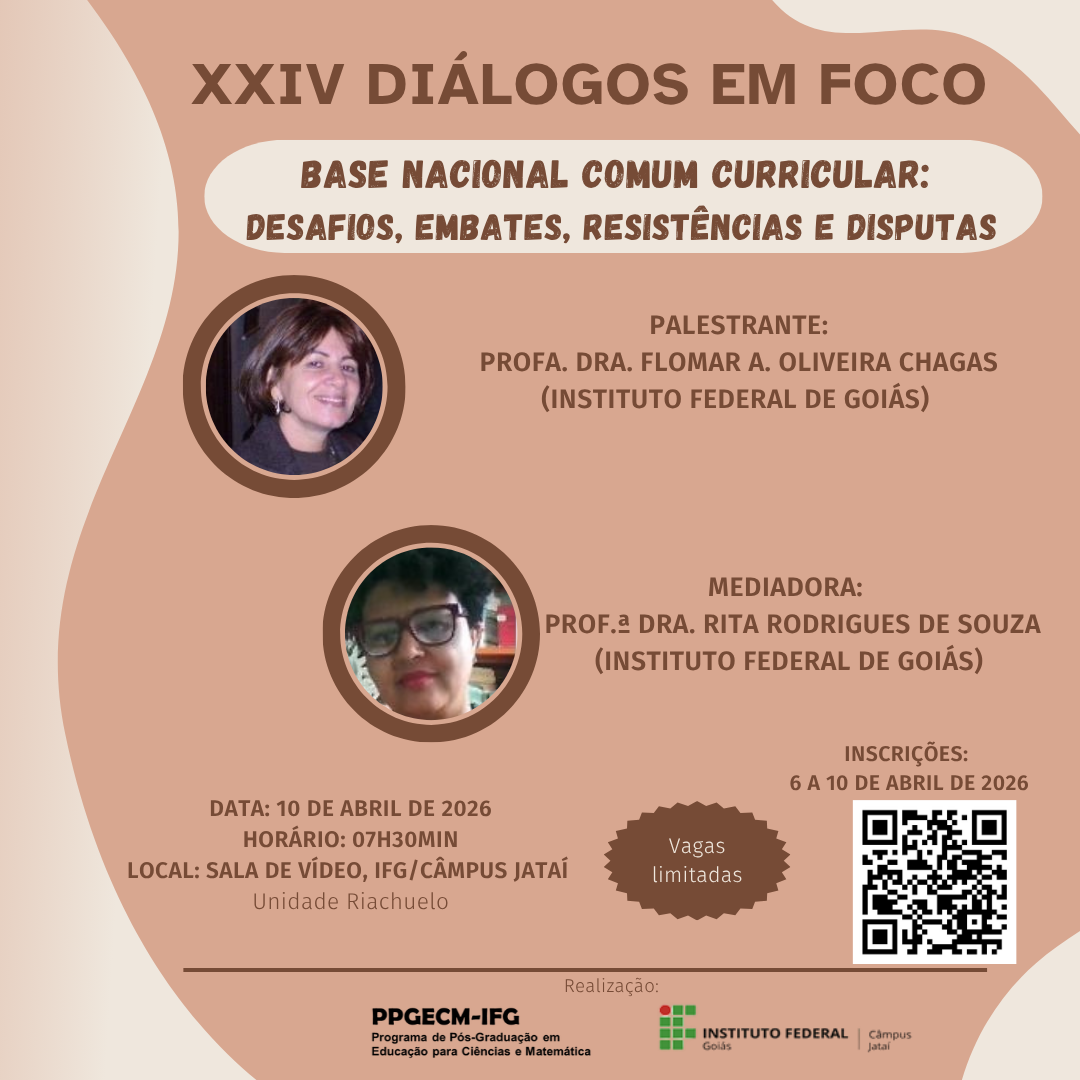 XXIV Diálogos em foco - Palestra: Base Nacional Comum Curricular: Desafios, embates, resistências e disputas - Profa. Dra. Flomar A. Oliveira Chagas Data: 10 de abril de 2026 Horário: 7h30min Local: INSCREVA-SE E PARTICIPE! - VAGAS LIMITADAS |