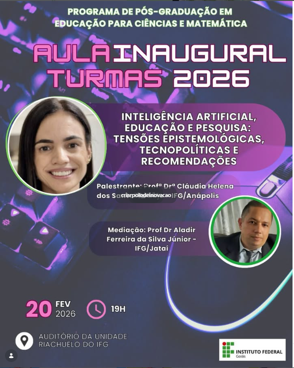 Aula Inaugural - Turmas 2025 - PPGECM/IFG Data: 07/02/2025 Horário: 19h Local: Auditório - IFG - Unidade Riachuelo XV Diálogos em foco - Palestra BNCC: a quem serve? - Profa. Dra. Flomar Ambrosina Oliveira Chagas Data: 11 de abril de 2025 Horário: 7h30min Local: Sala de Defesa PPGECM/IFG - Unidade Riachuelo XVI Diálogos em foco - Palestra: Currículo, discurso e identidade - Profa. Dra. Mara Rubia de Souza Rodrigues Morais Data: 09 de maio de 2025 Horário: 7h30min Local: Sala de Defesa PPGECM/IFG - Unidade Riachuelo XVIII Diálogos em foco - Palestra - O método materialismo histórico dialético e a pesquisa em educação - Prof. Me. Leonardo Carlos de Andrade (IFGoiano) XIX Diálogos em foco - Palestra - O conceito de Deficiência e sua tradução nas políticas educacionais: avanços, limites e perspectivas - Profa. Dra. Lidiane de Lemos Soares Pereira - Data: 13 de junho de 2025 Horário: 7h30min Local: Sala de Vídeo - PPGECM/IFG - Unidade Riachuelo XX Diálogos em foco - Palestra: Formação de professores pesquisadores e políticas Públicas em Ciências e Matemática: por uma construção coletiva, crítica e emancipatória - Profa. Dra. Rosenilde Nogueira Paniago - Data: 27 de junho de 2025 Horário: 13h15min Local: XXI Diálogos em foco - Palestra: PNED - Política Nacional de Educação Digital: possibilidades e +desafios - Prof. Dr. Leizer Fernandes Moraes - Data: 04 de julho de 2025 Horário: 7h30min Local: 3° Seminário de Validação das Propostas de Produtos Educacionais - Data: 04 e 05 de julho de 2025 - a partir das 13h15min Local: IFG - Unidade Riachuelo XIII Seminário de Pesquisa - PPGECM/IFG - Evento Online Data: 29 de setembro a 02 de outubro de 2025 |