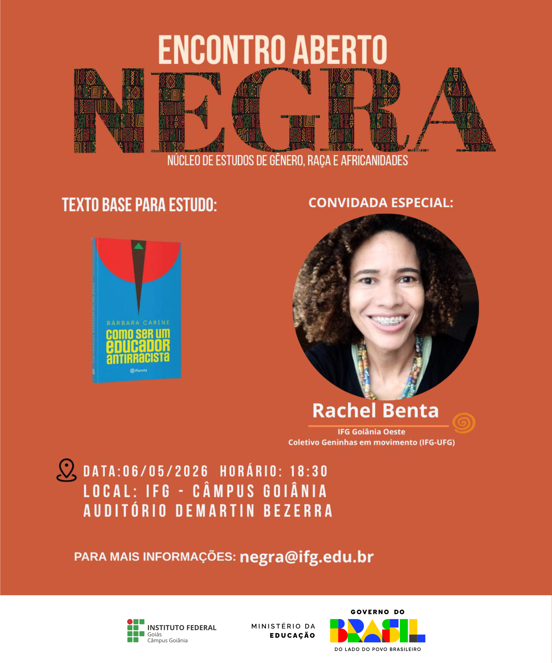 O Núcleo de Estudos de Gênero, Raça e Africanidades (NEGRA) do Instituto Federal de Goiás (IFG) promove, no próximo dia 6 de maio (quarta-feira), encontro aberto à comunidade voltado à discussão da educação antirracista. A atividade será realizada das 18h30 às 20h, no auditório Demartin Bezerra, no Câmpus Goiânia do IFG. Podem participar pessoas das comunidades interna e externa ao IFG.