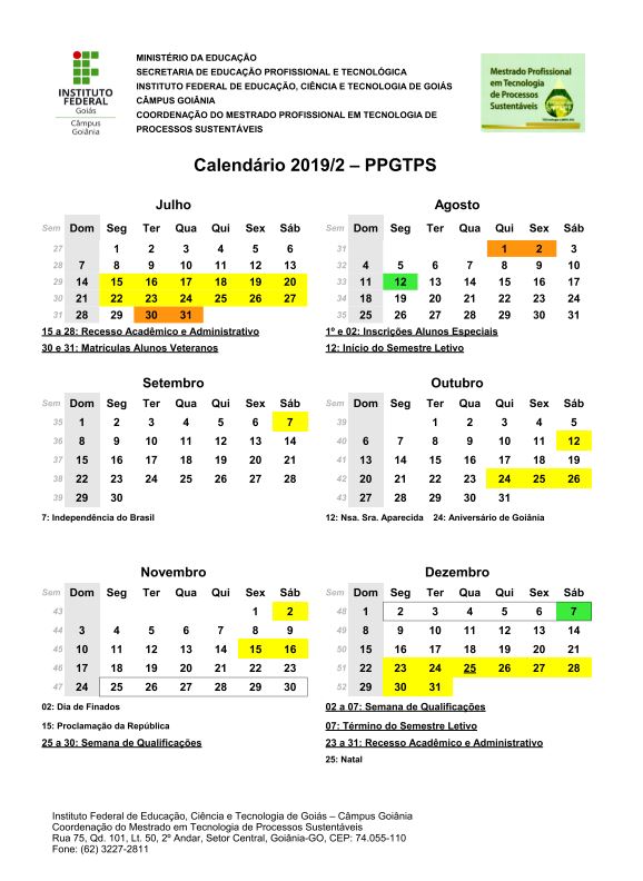 Confira o Calendário Acadêmico para o segundo semestre do ano de 2019 do Programa de Mestrado Profissional em Tecnologia de Processos Sustentáveis.