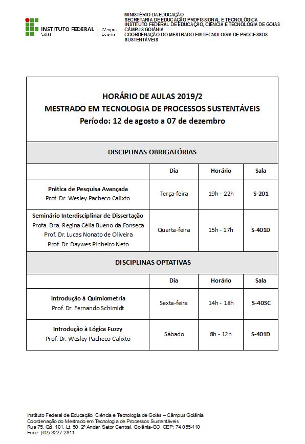 Não se perca! Está disponível o horário de aulas para o semestre 2019/2 do Programa de Mestrado Profissional em Tecnologia de Processos Sustentáveis.