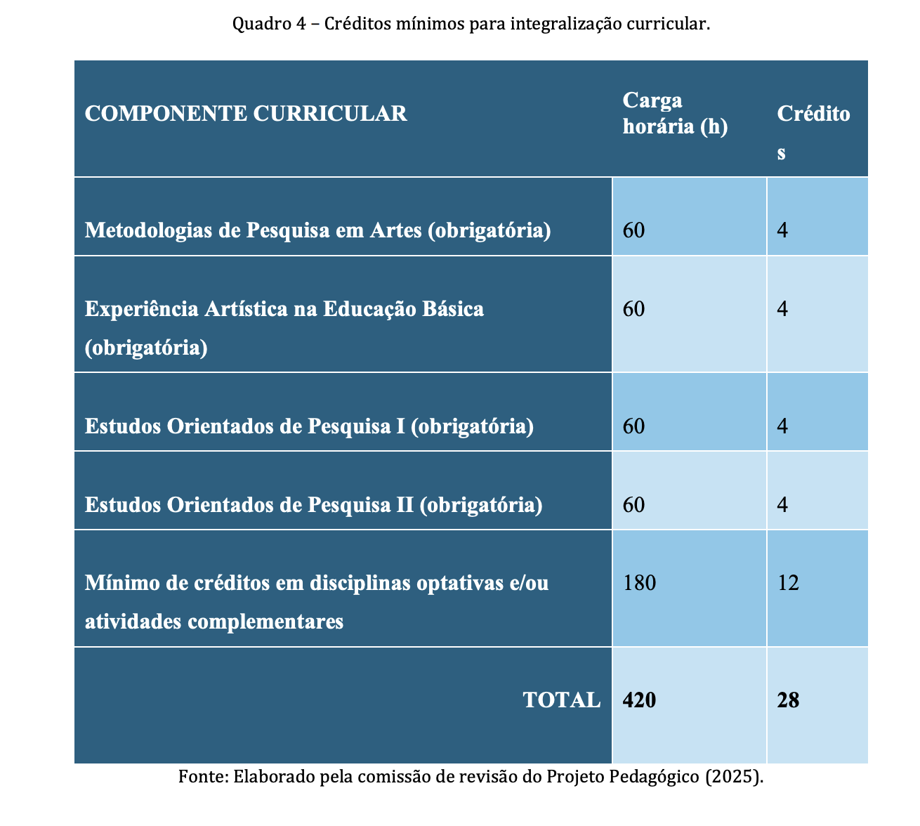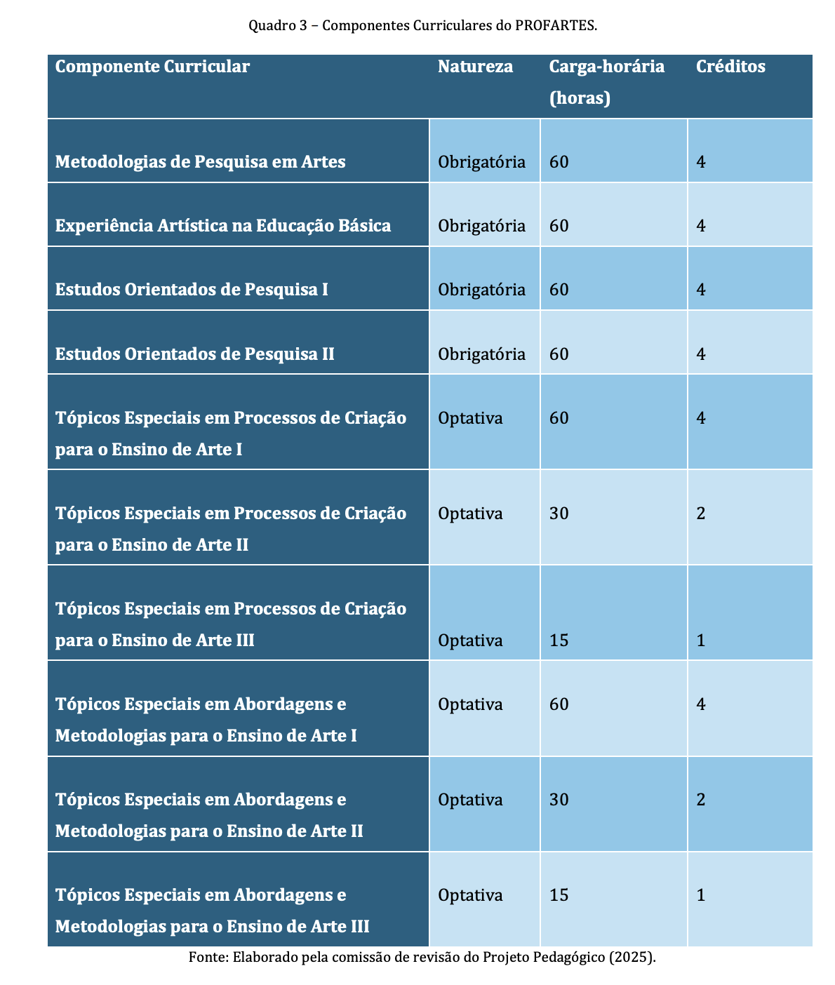 O Projeto Pedagógico de Curso do PROFARTES está em fase de revisão, bem como suas linhas de pesquisa e regimento geral. Foi aprovada pelo Conselho Gestor a Resolução que regulamenta e define as modalidades e procedimentos do Exame de Trabalho de Conclusão – Defesa Pública, do Exame de Qualificação, bem como os procedimentos da comprovação de Suficiência em Língua estrangeira. Aprovada e em fase final de tramitação, a nova resolução revoga as anteriores e aplica-se às turmas que ingressaram em 2025.