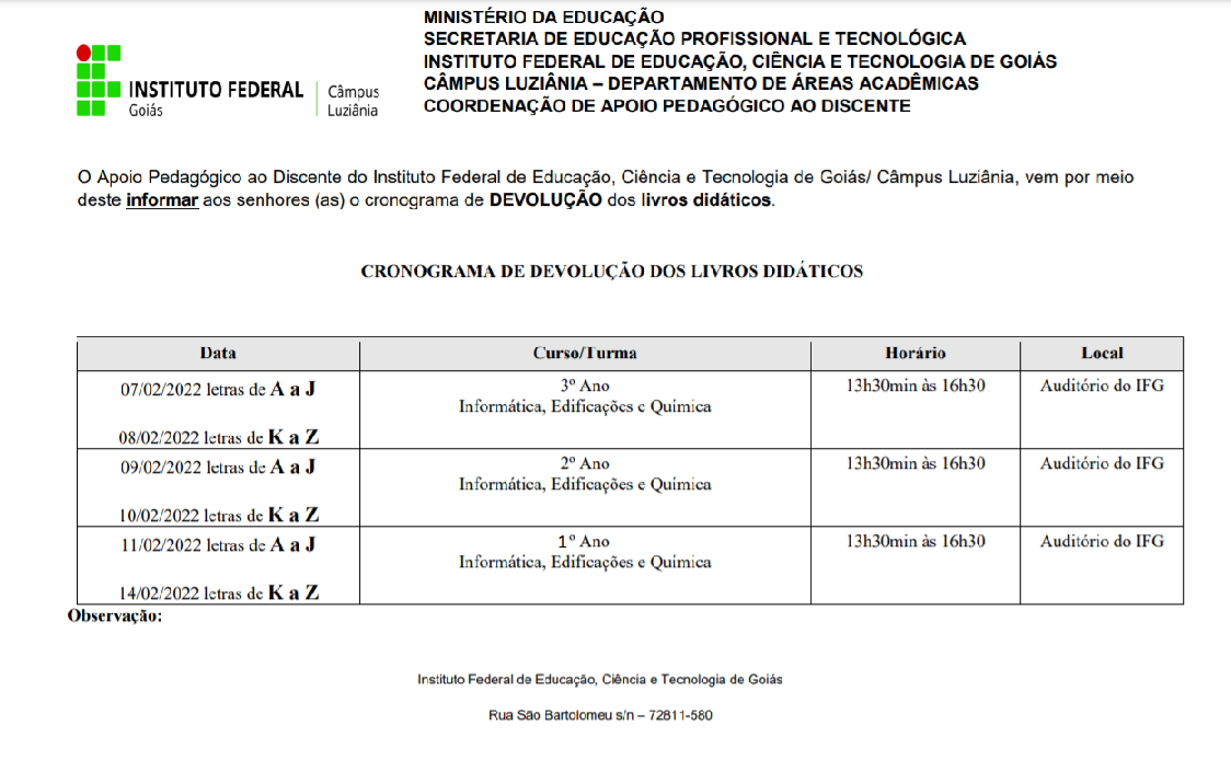Segue cronograma de devolução dos livros didáticos pelos estudantes do ensino médio: