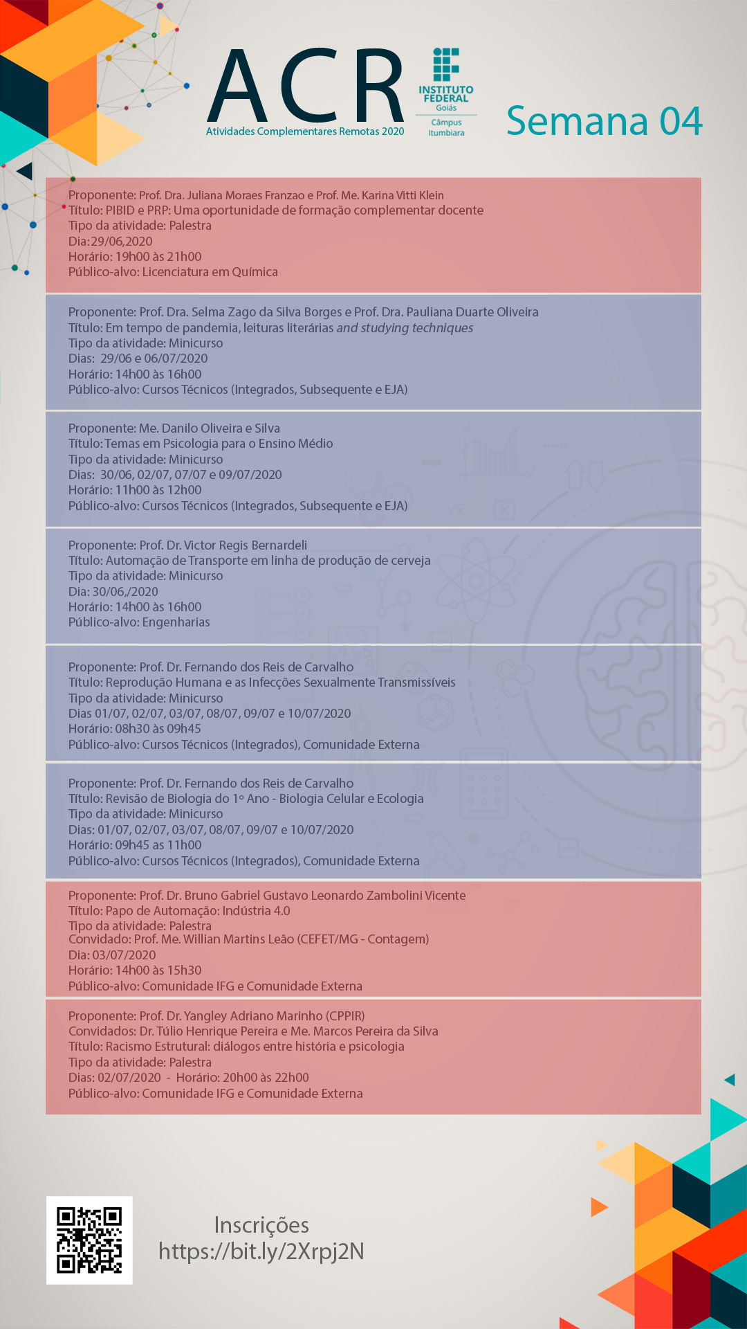 Estão abertas as inscrições para a Semana 4 de Atividades Complementares Remotas (ACsR), ofertada pelo IFG Câmpus Itumbiara. Podem se inscrever para participar gratuitamente alunos, servidores e demais pessoas da comunidade externa. As ACsR têm por objetivo ofertar atividades para o público do nível médio e ensino superior, neste período de suspensão do calendário acadêmico e isolamento social.