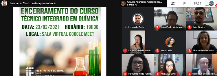 O distanciamento físico não impediu que a Aula da Saudade virtual da turma de 3ª ano do curso Técnico Integrado em Química fosse repleta de carinho, homenagens e muitas risadas. O encontro foi organizado pelo coordenador do curso, professor Leonardo Magalhães de Castro, e contou com a participação de outros docentes convidados pela classe.