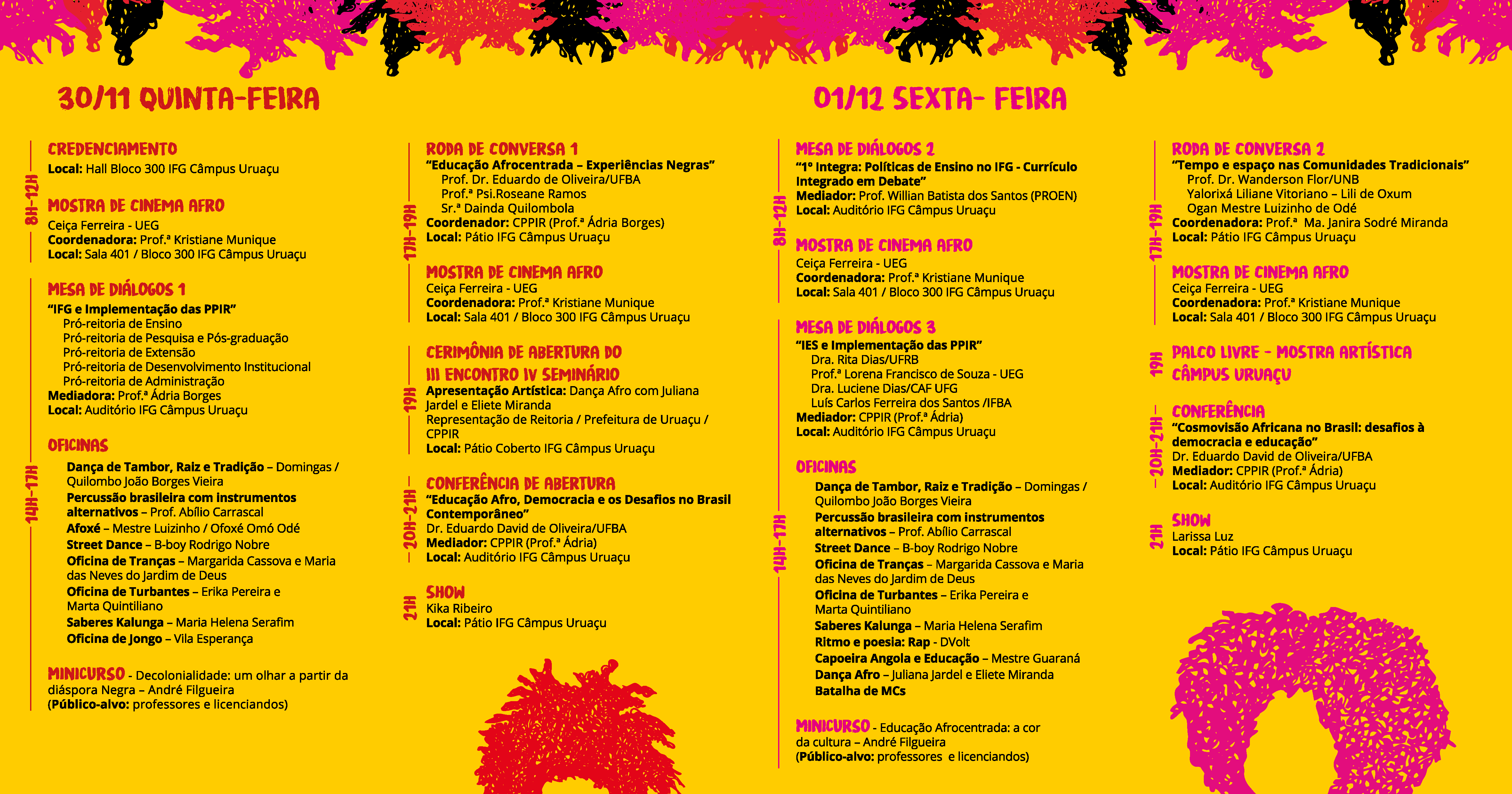 Pela programação, ocorrerá dentro do Encontro o IV Seminário de Educação para as Relações Étnico-Raciais e o Congresso de Estudantes do IFG, ambos com inscrições separadas. O Congresso será realizado no dia 30, das 16 às 18 horas; dia 1º/12, das 8 às 12 horas e das 14 às 18 horas; e no dia 2, das 8 às 12 horas.