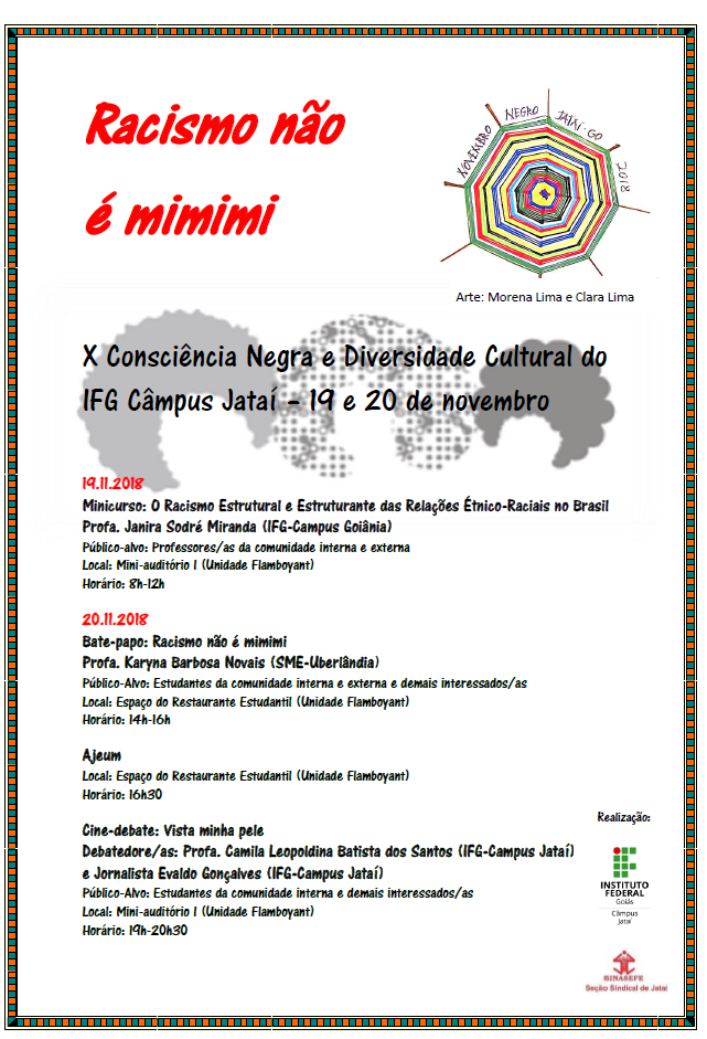 Acontecerá nos dias 19 e 20 de novembro de 2018 no IFG Câmpus Jataí, unidade Flamboyant, o evento Consciência Negra e Diversidade Cultural, em sua décima edição, com o tema: "Racismo não é mimi: o Racismo Estrutural e Estruturante das Relações Étnico-Raciais no Brasil".