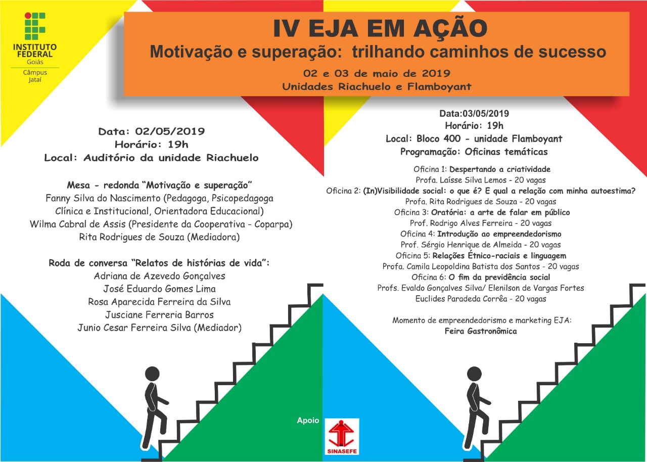 O Instituto Federal de Goiás – (IFG) Câmpus Jataí e o Sinasefe Jataí promovem nos dias dois e três de maio a IV edição do EJA em Ação, cujo tema é “Motivação e superação: trilhando os caminhos do sucesso”. O evento é uma iniciativa da coordenação do curso de Secretariado em parceria com o sindicato dos servidores do Instituto e visa promover a integração entre os estudantes do curso e o fortalecimento da área acadêmica correlata.