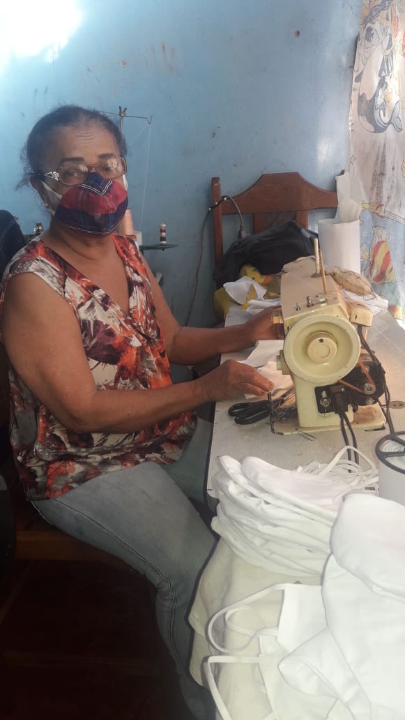 Dona Enedida, costureira participante do Projeto, produzindo as máscaras do modelo anatômico tamanho adulto.