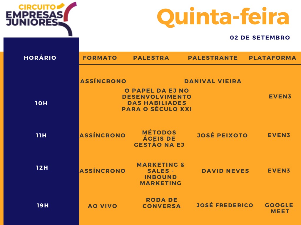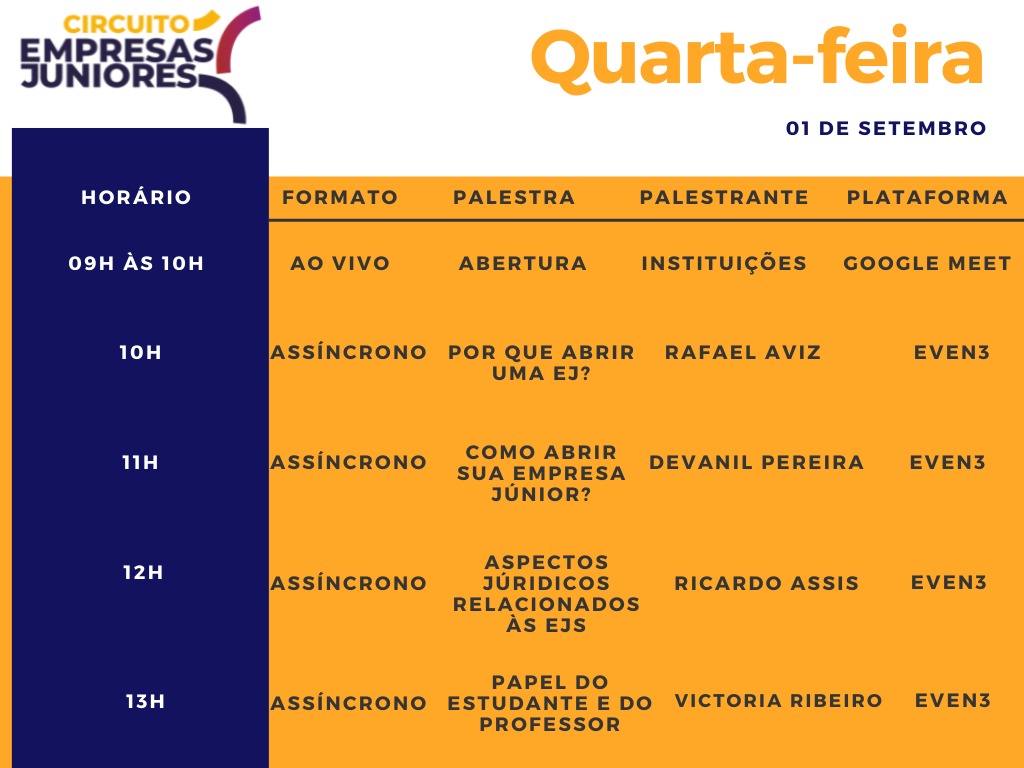 O I Circuito Empresas Juniores contará em seus dois dias de atividades de forma online, com conteúdo transmitido ao vivo e gravado, voltados à discussão do empreendedorismo durante a graduação, por meio das Empresas Juniores (EJ), as quais proporcionam a excelente oportunidade aos estudantes de cursos superiores vivenciar na prática os desafios do mundo do trabalho durante a vida acadêmica. A seguir a programação do evento: