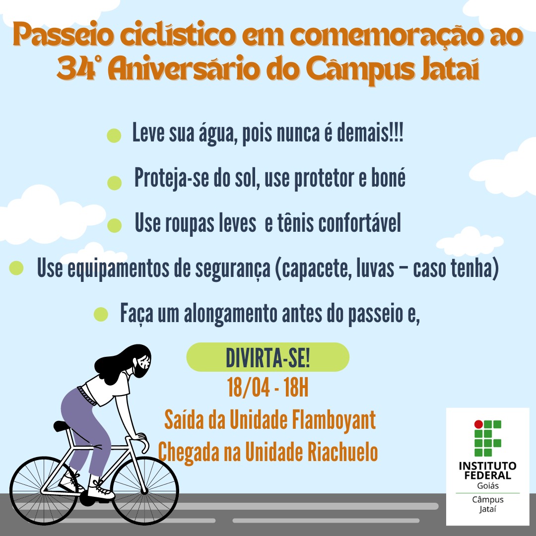 Na próxima segunda-feira, 18 de abril, o Câmpus Jataí do Instituto Federal de Goiás (IFG) celebrará seu aniversário de 34 anos. As comemorações ocorrerão ao longo de todo o dia e, entre outras atividades, será realizado passeio ciclístico entre as Unidades Flamboyant e Riachuelo. A concentração do passeio está marcada para as 18 horas na Unidade Flamboyant e o comboio de ciclistas deverá seguir até a Unidade Riachuelo.