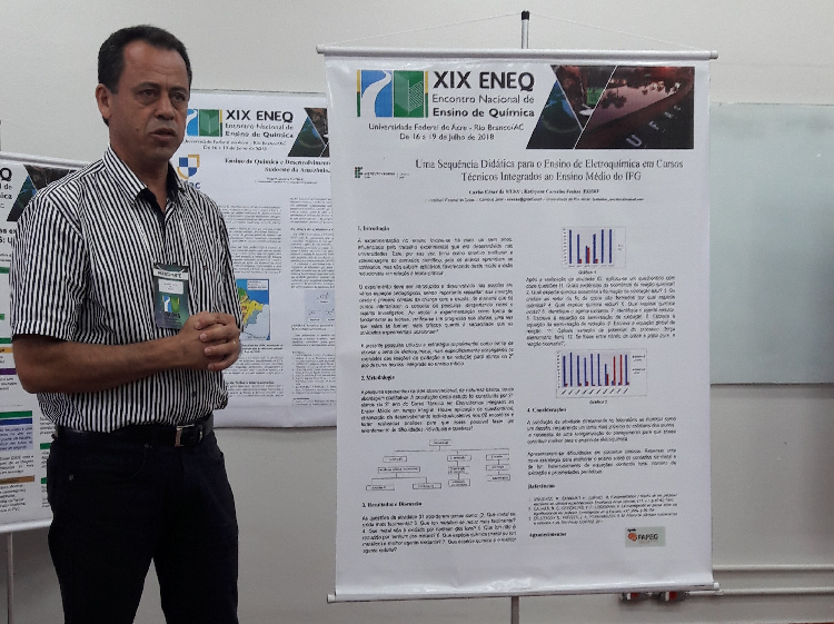 O trabalho relatou a contribuição das atividades experimentais para o ensino de eletroquímica no ensino médio, de autoria dos professores Carlos Cézar da Silva (orientador, IFG), Kathynne Carvalho Freitas Ferri (orientada, UNIRV) e teve o apoio da Fundação de Amparo à Pesquisa do estado de Goiás (FAPEG –GO), por meio da chamada pública 01/2018 que trata da seleção pública de propostas para apoio à participação em Eventos Científicos e/ou Tecnológicos.