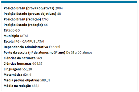 Considerando que o foco do IFG não é apenas o prosseguimento dos estudos, mas também a formação cidadã e profissional, o que reduz a carga horária de disciplinas exigidas pelo Enem, verifica-se a qualidade do processo de ensino-aprendizagem no Câmpus Jataí.