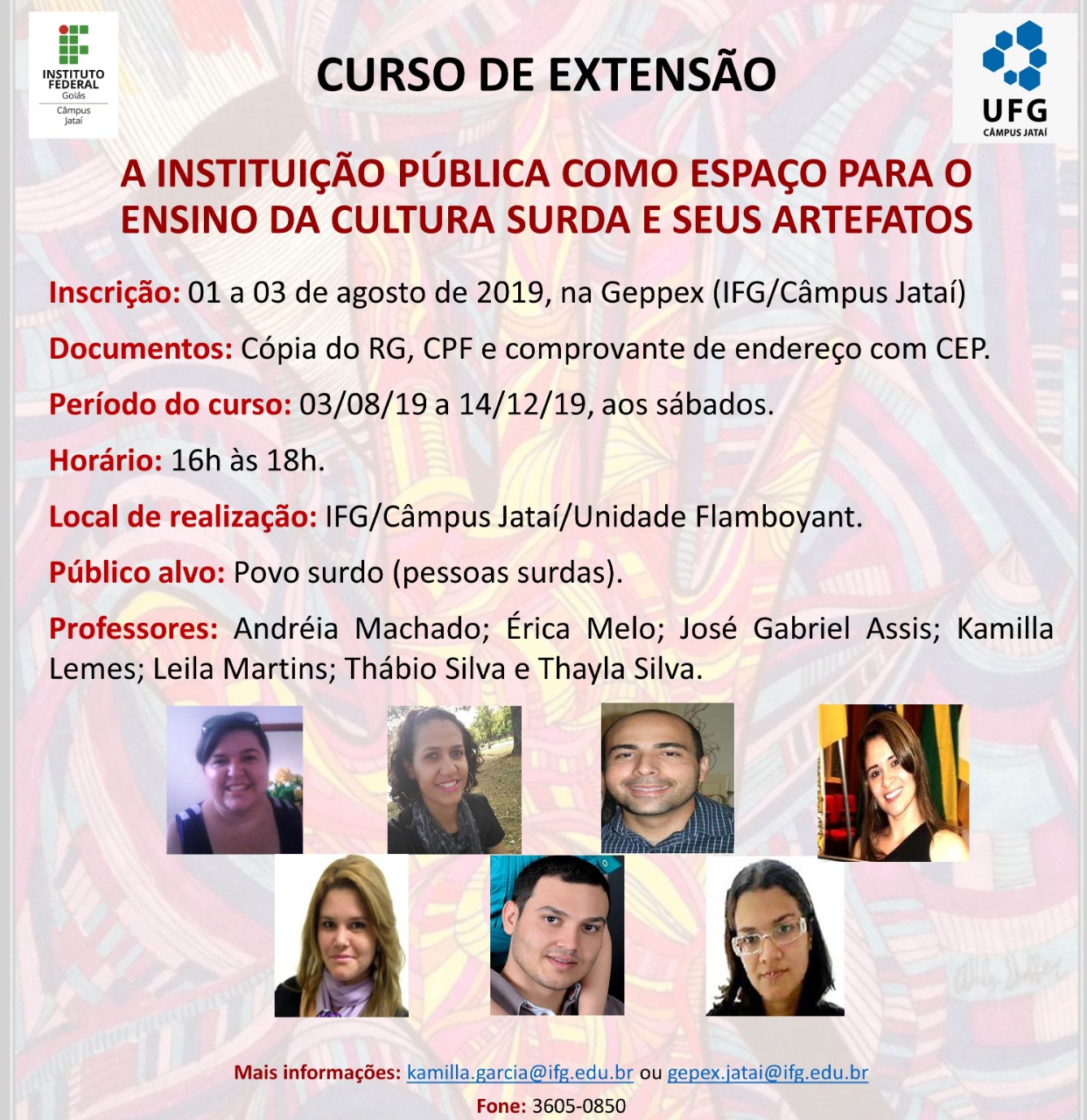 Já está disponível o edital para o curso de extensão “A Instituição Pública como espaço para o ensino da cultura surda e seus artefatos”, organizado pelo Instituto Federal de Goiás (IFG) – Câmpus Jataí. O curso oferece 30 vagas, sendo seis destinadas à comunidade interna e os outros 24 para a comunidade externa do IFG. A inscrição será realizada exclusivamente no dia 1º de...