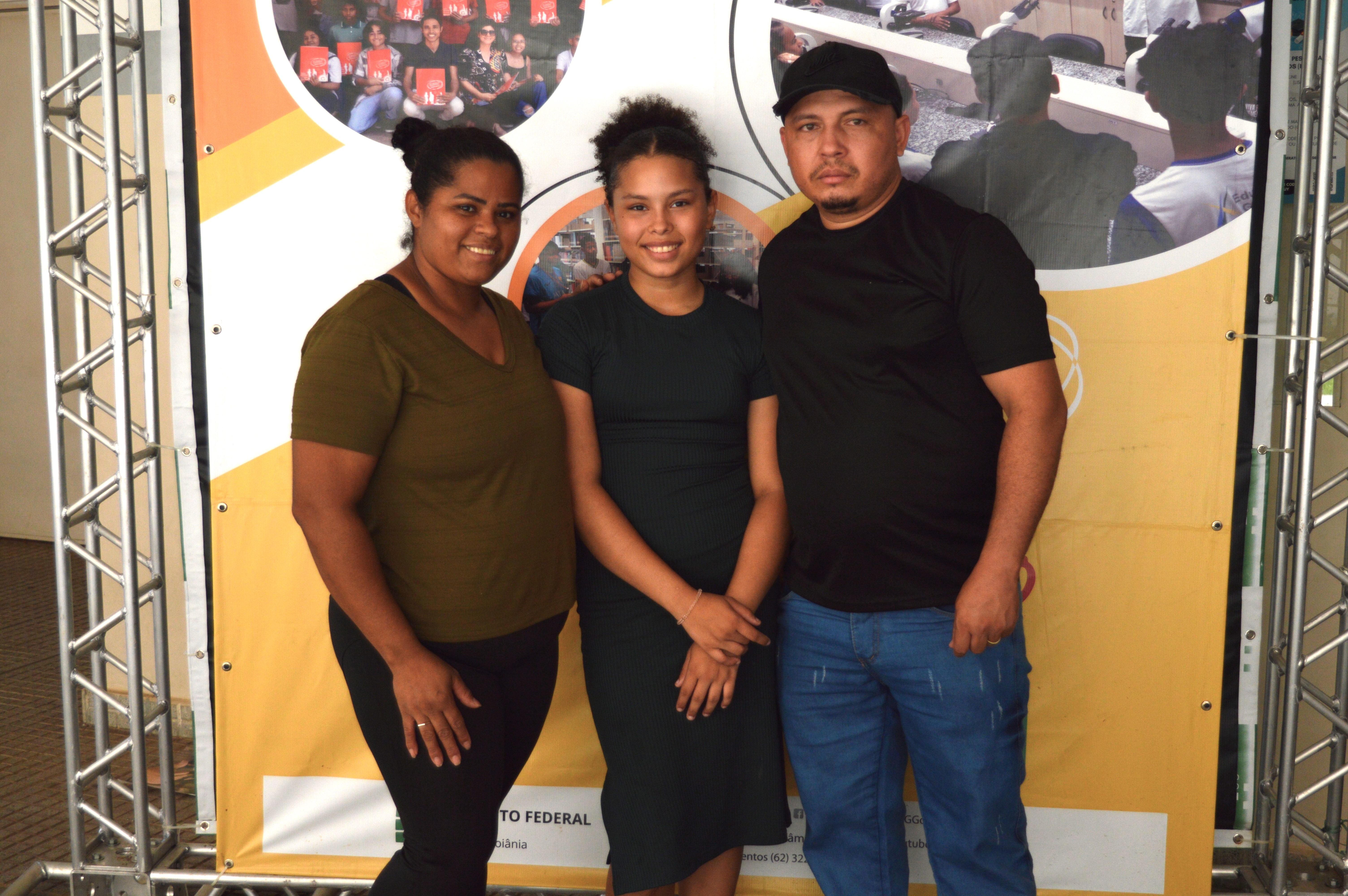 Raquel Silva, ao centro, veio acompanhada dos pais. A mãe dela, Regiane, é estudante do curso técnico em Gastronomia, ofertado na modalidade educação de jovens e adultos pelo Câmpus Goiânia
