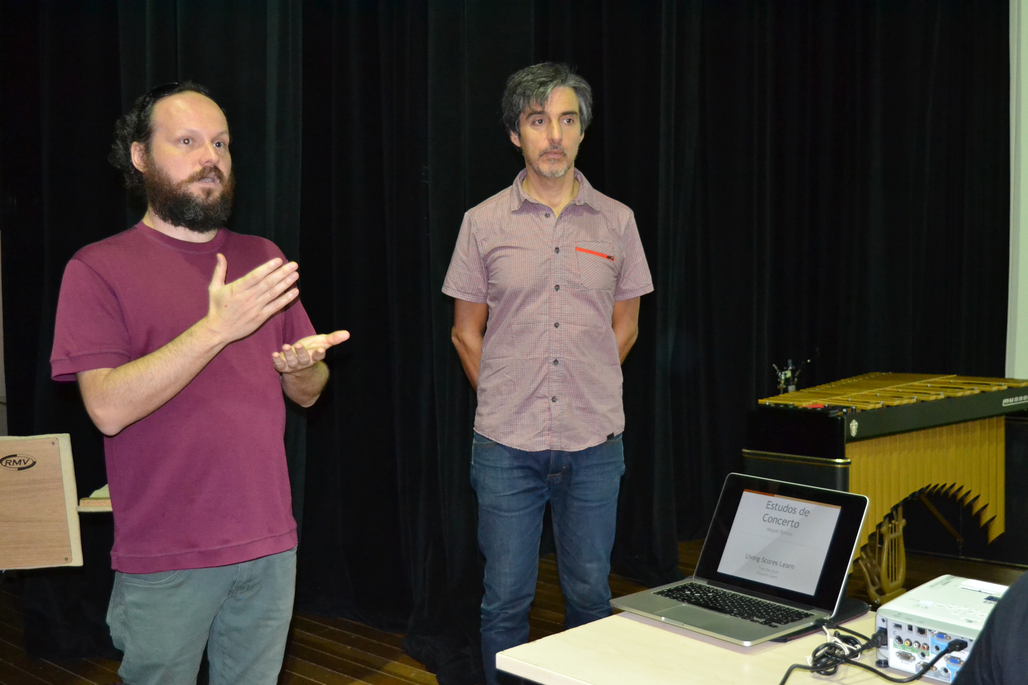 Coordenador do Properc no IFG e professor, Ronan Gil, e o professor e músico convidado Miquel Bernat, no Teatro do IFG.