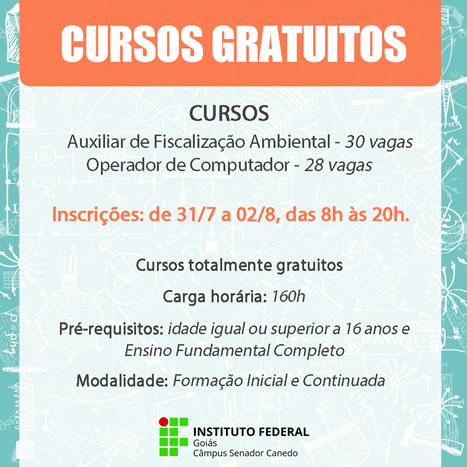 A partir de segunda-feira, 31/7, até quarta-feira, 02/8, o Câmpus Senador Canedo do Instituto Federal de Goiás (IFG) recebe inscrições para os cursos de Auxiliar de Fiscalização Ambiental (30 vagas) e Operador de Computador (28 vagas), na modalidade de Formação Inicial e Continuada (FIC). Os cursos são gratuitos, e destinados à capacitação e profissionalização.