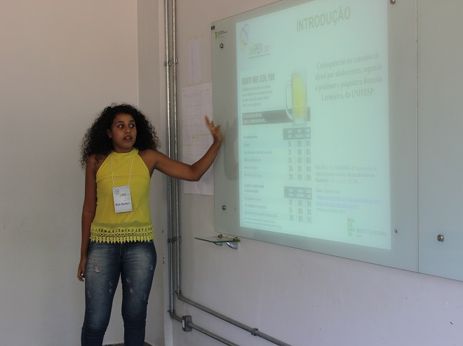 A estudante de Química do Câmpus Itumbiara Daila Barreto, orientanda do professor Fernando dos Reis, foi uma das alunas que apresentou trabalho ontem, 10. Ela conta que o professor apresentou a ela algumas sugestões de tema para pesquisa. Ela escolheu o alcoolismo porque conhecia adolescentes que bebiam e sentiu interesse em pesquisar o tema. “Gostei da experiência, tanto no aspecto emocional, porque eu estava muito nervosa, como pela preparação”, finaliza a aluna (assista um pouquinho da apresentação de Daila).