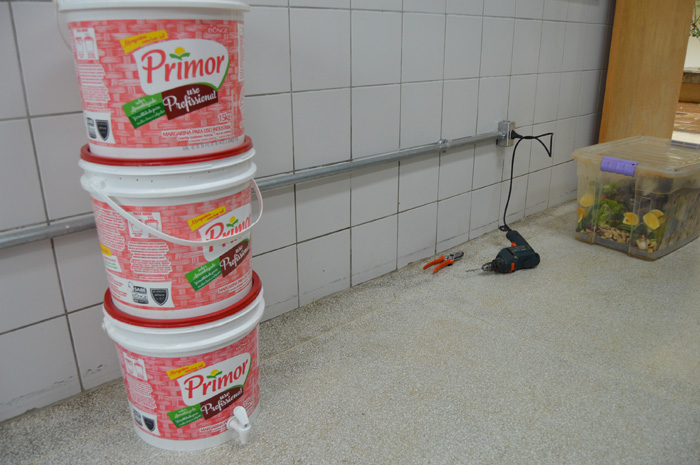 - Pequenos furos devem ser feitos na tampa dos recipientes e na parte de baixo. Atenção para o reservatório que irá ficar por baixo dos outros dois, este apenas deve ter furo na tampa, nele ficará armazenado o chorume ( o líquido que irá escorrer pelo sistema e que depois -desde que diluído adequadamente- poderá ser utilizado para ser borrifado nas plantas, pois funciona como um fortificante).