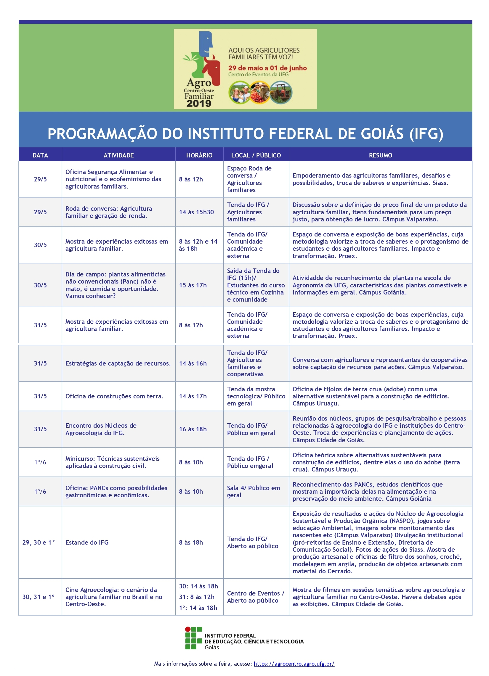 Oficina de Segurança Alimentar, rodas de conversa com os temas agricultura familiar e geração de renda e estratégias de captação de recursos para cooperativas de agricultores familiares, mostra de experiências exitosas em agricultura familiar, dia de campo sobre plantas alimentícias, oficina de construções com terra, encontro dos núcleos de agroecologia do Instituto Federal de Goiás (IFG), minicurso de técnicas sustentáveis para construção civil, oficina gastronômica, estande e cine agroecologia. Essas são algumas das atividades que o IFG vai promover durante a Agro Centro-Oeste Familiar 2019, que será realizada de 29 de maio a 1º de junho, no Centro de Eventos da UFG (Campus Samambaia).