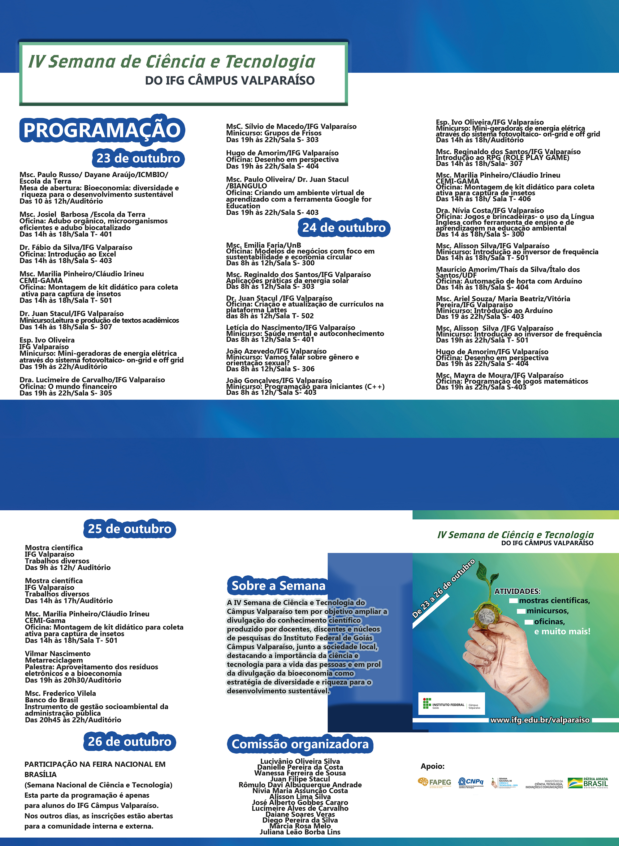 Podem participar tanto a comunidade interna como externa. Pesquisadores e especialistas de diversas instituições estarão disponibilizando oficinas, palestras e outras atividades entre os dias 23 a 26 de outubro, no IFG Câmpus Valparaíso. Quem participar terá direito à certificado. Veja a programação completa aqui e se inscreva nos conteúdos que mais interessar a você! Não deixe de participar! É gratuito!