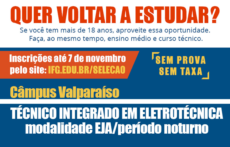 Estão abertas as inscrições para o curso técnico integrado em Eletrotécnica (EJA) do IFG Câmpus Valparaíso