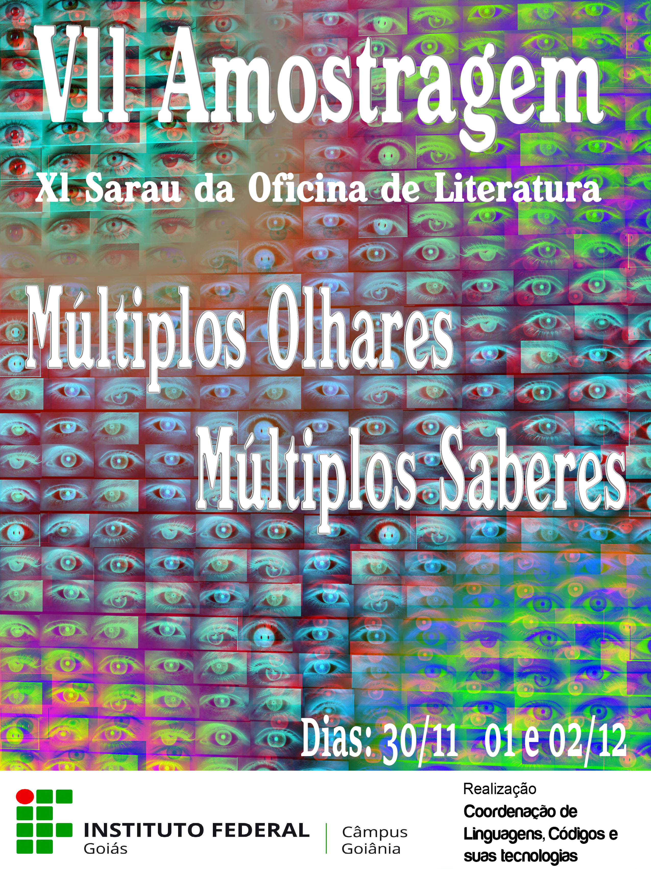 De 30 de novembro a 2 de dezembro, o Câmpus Goiânia do Instituto Federal de Goiás (IFG) promove a sétima edição da Amostragem e XI Sarau da Oficina de Literatura, com a temática Múltiplos Olhares, Múltiplos Saberes. As inscrições são gratuitas e devem ser feitas até o dia 1º de dezembro pelo site do evento. Podem participar estudantes e servidores do IFG e pessoas da comunidade externa.