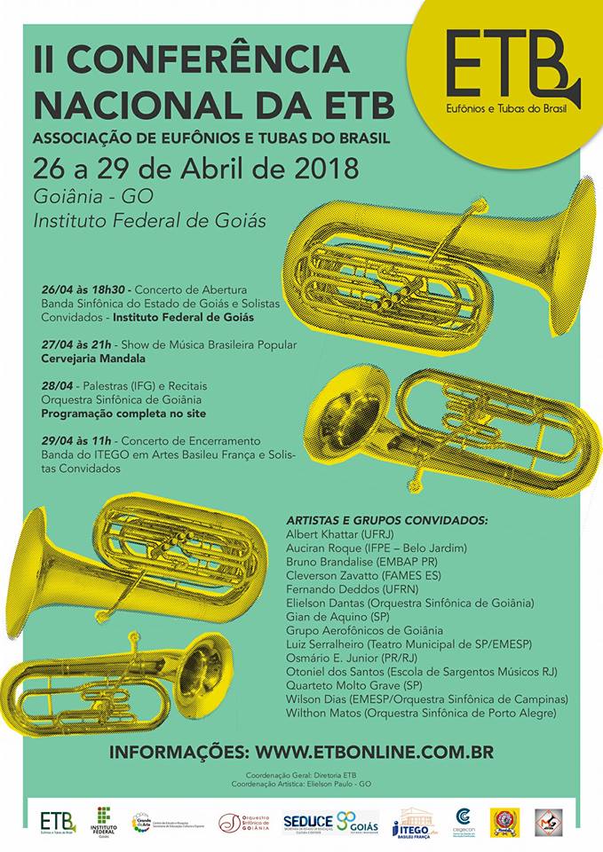 Entre os dias 26 e 28 de abril, o IFG – Câmpus Goiânia recebe parte da programação da II Conferência Nacional da Associação de Eufônios e Tubas do Brasil. Dentre as atividades, está o concerto de abertura do evento, que será atração desta semana do projeto Quinta Justa, no Teatro do IFG, a partir das 18 horas, com entrada franca.