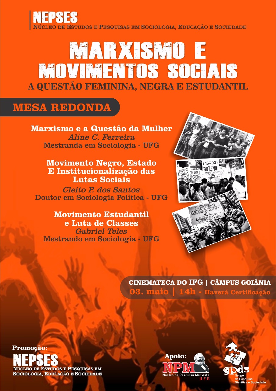 No dia 3 de maio, o Núcleo de Estudos e Pesquisas em Sociologia, Educação e Sociedade ( NEPSES) do Instituto Federal de Goiás (IFG) promoverá a mesa-redonda: Marxismo e movimentos sociais: a questão feminina, negra e estudantil, às 14 horas, na Cinemateca do Câmpus Goiânia.