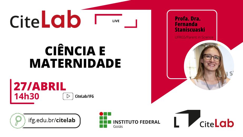 No dia 27 de abril, às 14h30, a Diretoria de Pesquisa e Inovação do IFG realizará uma live, juntamente com o Centro de Referência em Pesquisa e Inovação (CiteLab), com o tema "Ciência e Maternidade". A palestrante convidada será a Profa. Fernanda Staniscuaski (UFRGS/Parent in Science) e a mediação será com a Profa. Lorenna Costa. As inscrições são gratuitas e o evento será transmitido no canal do YouTube do CiteLab IFG. Participe!