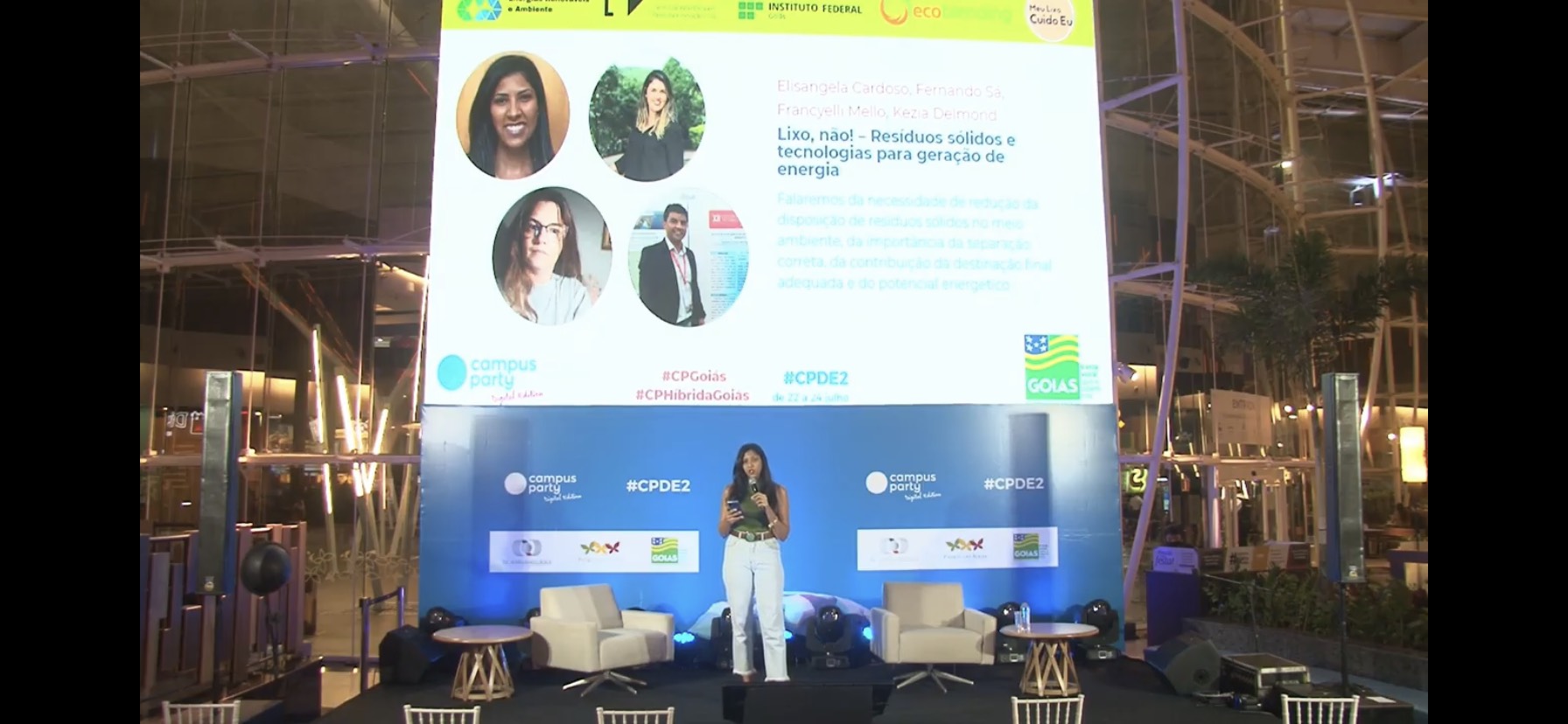 Servidora do Câmpus Goiânia, Francyelli Mello Andrade, durante apresentação na Campus Party 2021. Ela falou sobre o projeto "Lixo não - resíduos sólidos e tecnologias para geração de energia", que conta com a participação dos docentes Elisangela Cardoso de Lima Borges e Fernando Sá, do Câmpus Inhumas, e da professora Kezia Aguiar Delmond, da na Faculdade União de Goyases (Trindade)