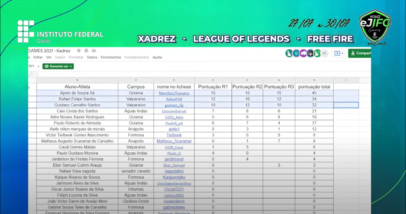 Em primeiro lugar, da equipe masculina, ficou o estudante do curso de Licenciatura em Música, Apolo de Souza Sá. Já na equipe feminina, classificaram: em primeiro lugar, Natália Arantes Andrade, da Licenciatura em Matemática, com 45 pontos; em segundo lugar, Rhydia Ianne Dionísio de Freitas, do curso técnico em Instrumento Musical, com 32 pontos; e em quarto lugar, Vitória Alves Pereira da Silva, da Licenciatura em Matemática, com 26 pontos. Além das classificadas, disputaram o torneio também a aluna Bruna Martins da Cunha Alves, do Câmpus Goiânia; Sunamita Vitória Rodrigues dos Santos, do Câmpus Valparaíso, que ficou em terceiro lugar na classificação geral com 30 pontos; Sophia Sussa, do Câmpus Jataí; e Maria Eduarda Barros do Câmpus Senador Canedo.