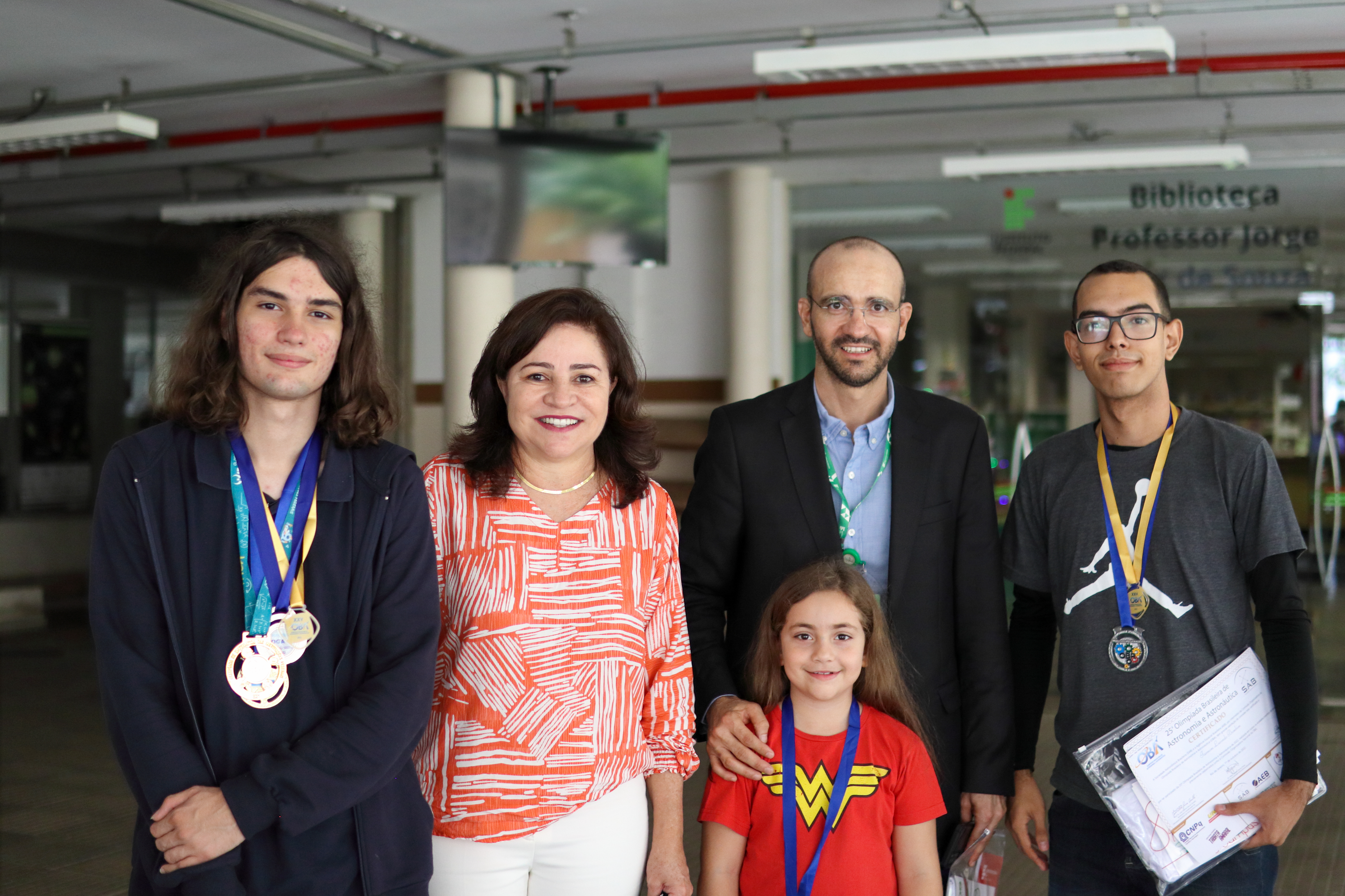 Os estudantes Enzo Morato e Pedro Cézar ao lado da diretora Adriana e do professor Fábio Marques