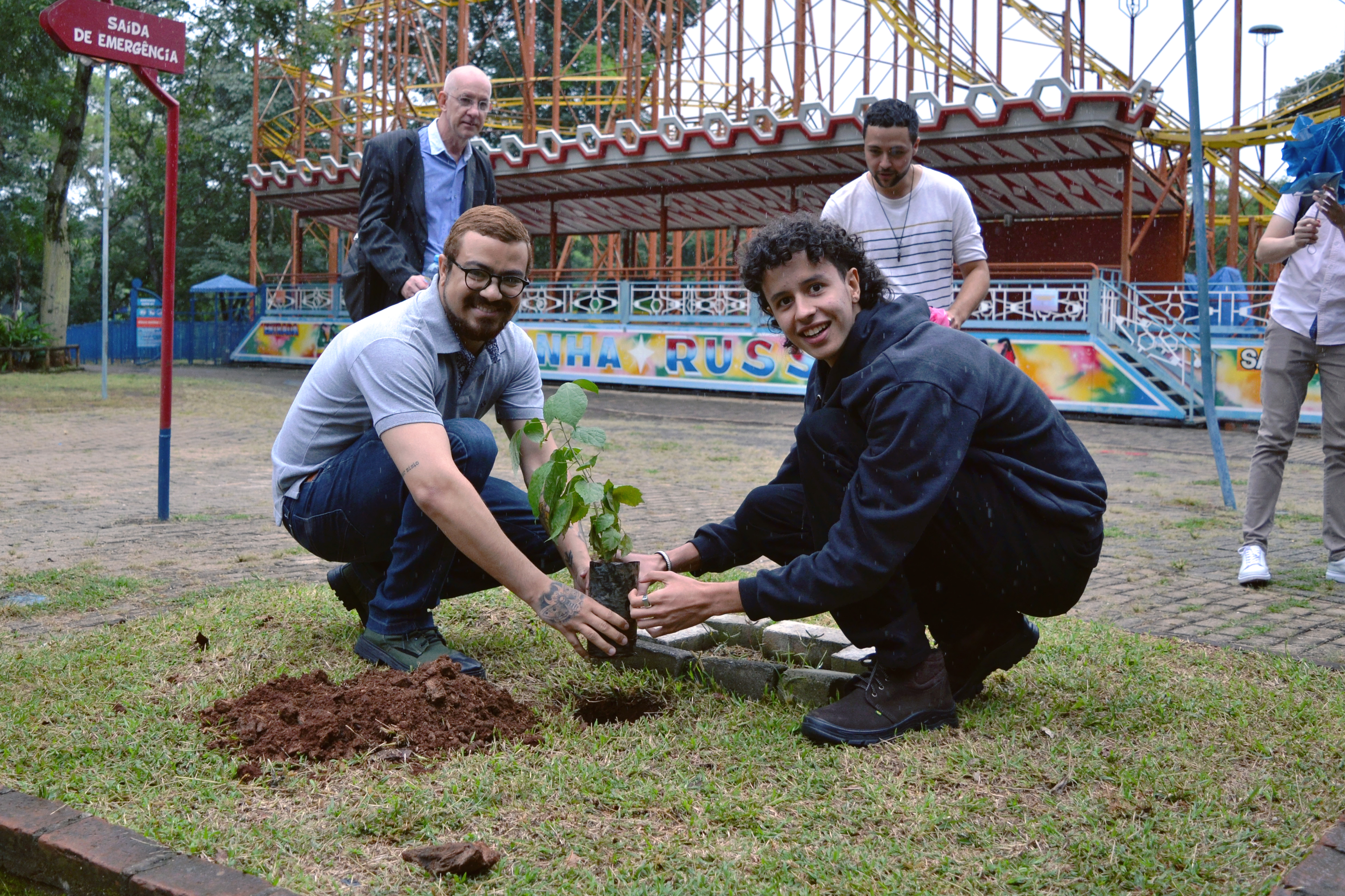 João Messias (egresso da 1ª turma) e Dalton Soares (1º colocado do último processo seletivo: 2023/1) são escolhidos para plantar a árvore no parque