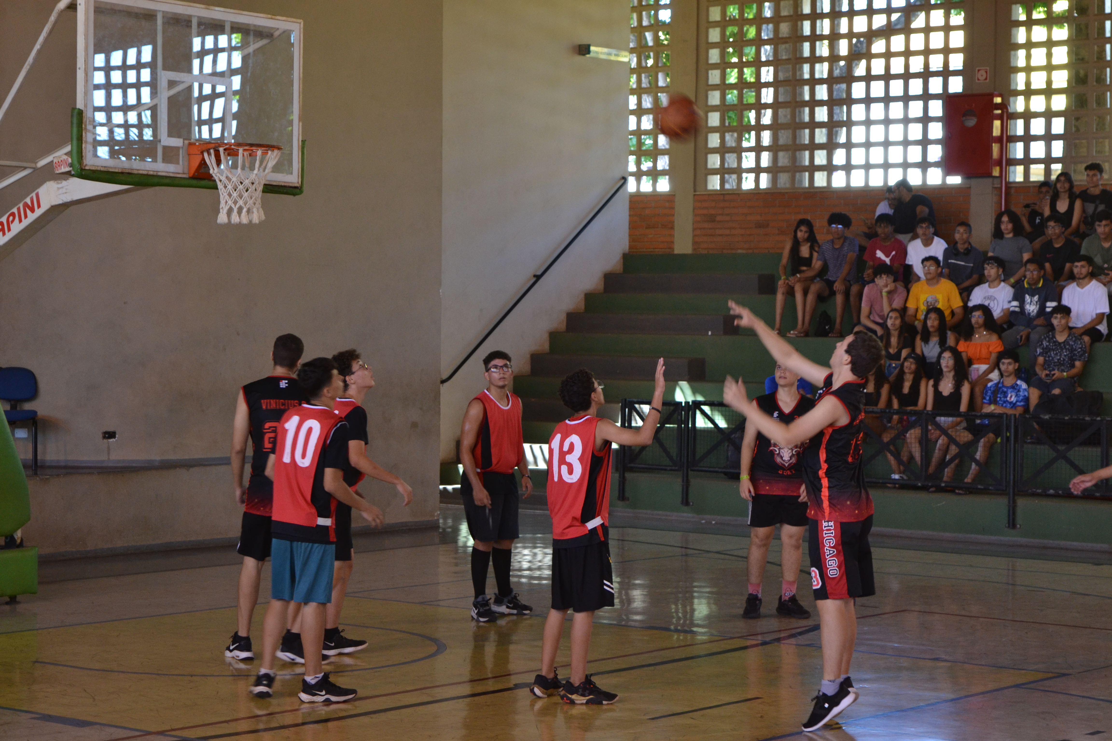 Bernardo em seu arremesso certeiro para a equipe de basquete do Câmpus Goiânia