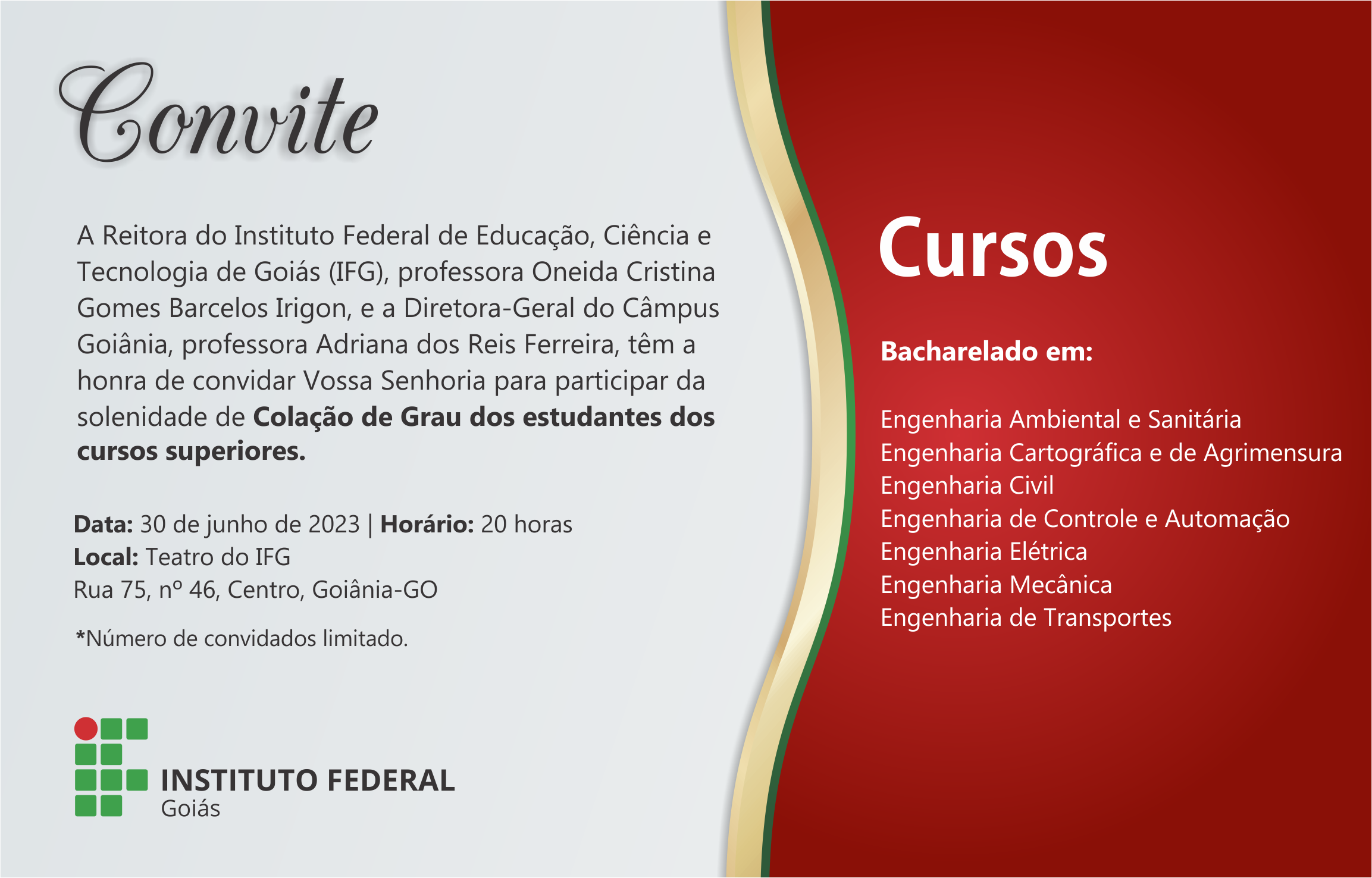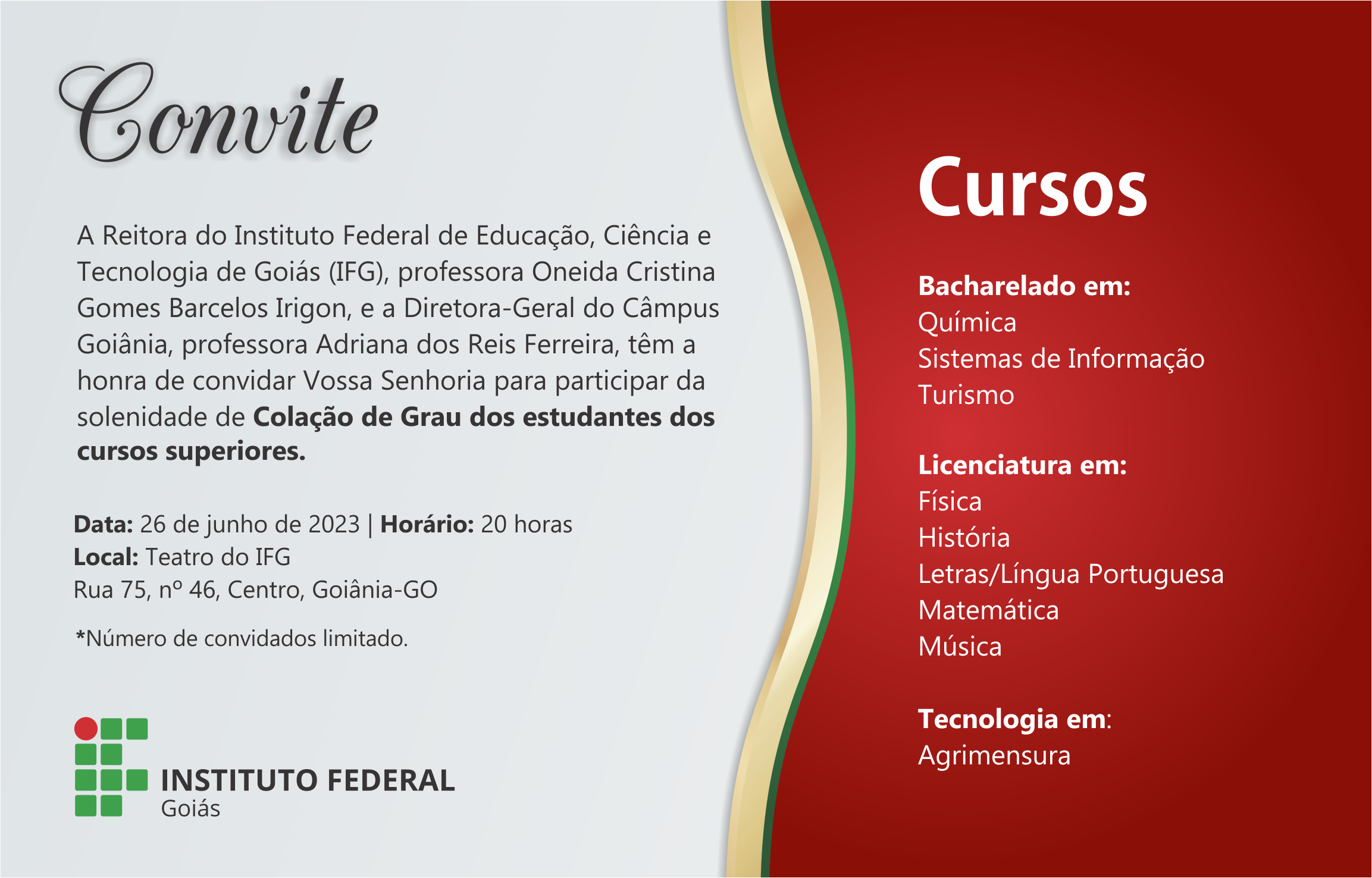 Prestes a completar 81 anos, celebrados no dia 5 de julho, o Câmpus Goiânia do Instituto Federal de Goiás (IFG) entregará à sociedade mais 91 novos profissionais, formados nos cursos superiores de diversas áreas do conhecimento. As solenidades de diplomação ocorrerão nos dias 26 e 30 de junho, às 20 horas, no Teatro do IFG, localizado na Rua 75, nº 46, Centro.