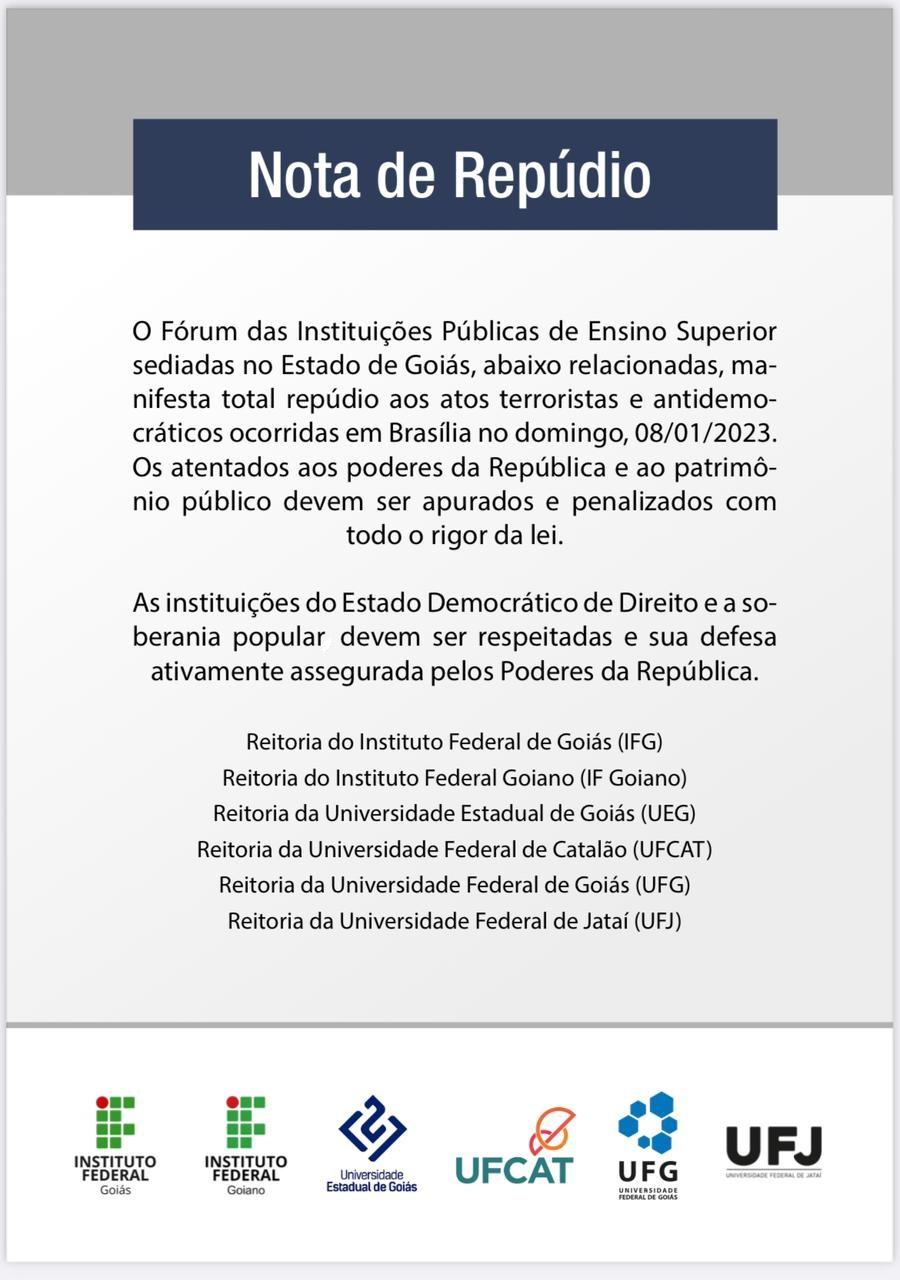 Nesse sentido, o IFG reforça a nota emitida neste domingo, 8 de janeiro, pelo Conselho Nacional das Instituições da Rede Federal de Educação Profissional, Científica e Tecnológica (Conif) e, também, a nota emitida pelo Fórum das Instituições Públicas de Ensino Superior Sediadas no Estado de Goiás, em virtude dos atos de vandalismo registrados hoje em Brasília/DF.