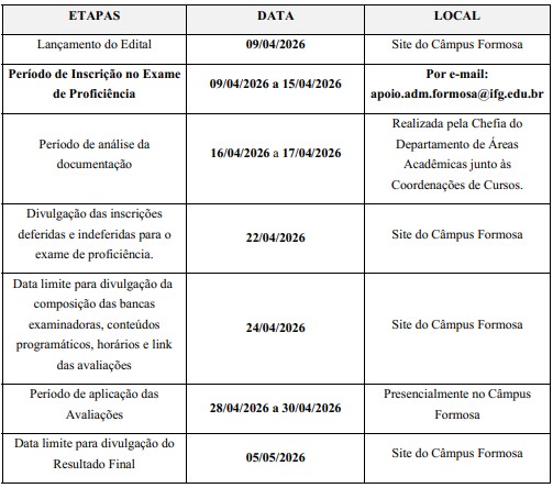 As inscrições para o Exame de Proficiência estão abertas até 15 de abril, quarta-feira. Para participar, os estudantes devem enviar o formulário de inscrição e a documentação comprobatória em formato PDF para o e-mail apoio.adm.formosa@ifg.edu.br  .