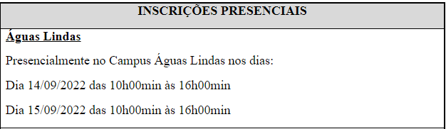 São ofertadas 20 vagas para a comunidade externa do Câmpus Águas Lindas. As interessadas deverão fazer a inscrição até o dia 15 de setembro via formulário (https://forms.gle/cdee7bz5ZTysJFCc7) ou comparecer à Gerência de Pesquisa, Pós-Graduação e Extensão (GEPEX), nos dias e horários listados abaixo: