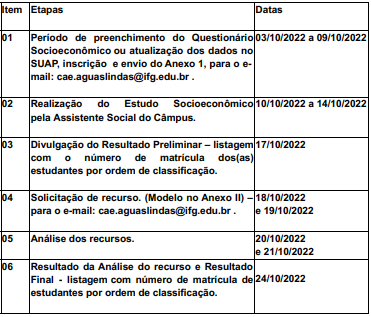 Para realizar a inscrição, os interessados deverão preencher ou atualizar o Questionário Socioeconômico no SUAP (http://suap.ifg.edu.br) e enviar o formulário de inscrição (Anexo I) para o e-mail: cae.aguaslindas@ifg.edu.br. Os interessados podem verificar o passo a passo completo para a inscrição no item 2.3 do edital.